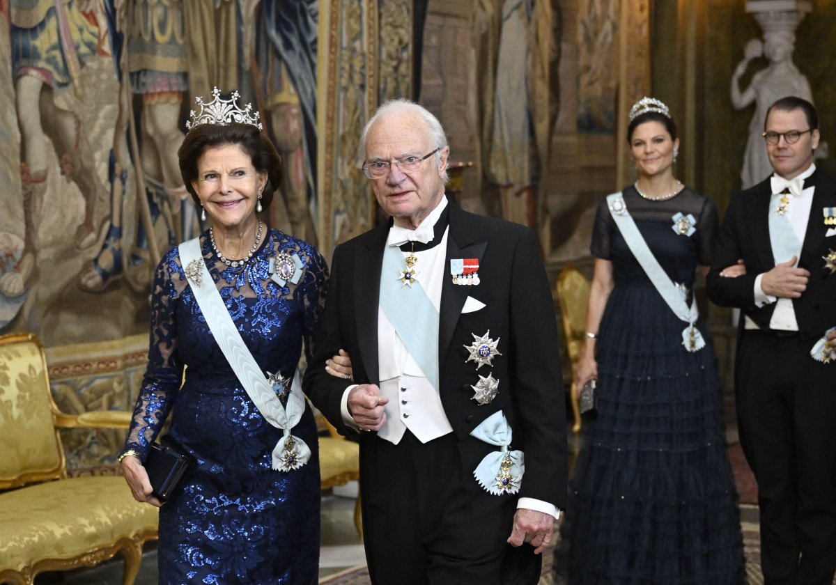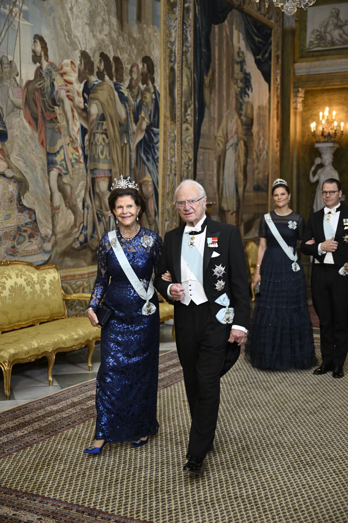 King Carl XVI Gustaf and Queen Silvia of Sweden were joined by their children and their spouses, Crown Princess Victoria and Prince Daniel, Prince Carl Philip and Princess Sofia, and Princess Madeleine and Christopher O’Neill, for the annual King’s Dinner, which celebrates the achievements of this year’s Nobel laureates. The dinner, which is held at the Royal Palace each year on the day after the Nobel ceremony, was a little subdued this year following the recent death of the King’s sister, Princess Birgitta. You’ll note that each of the royal ladies in attendance opted for gowns in shades of dark blue or navy for this year’s dinner.