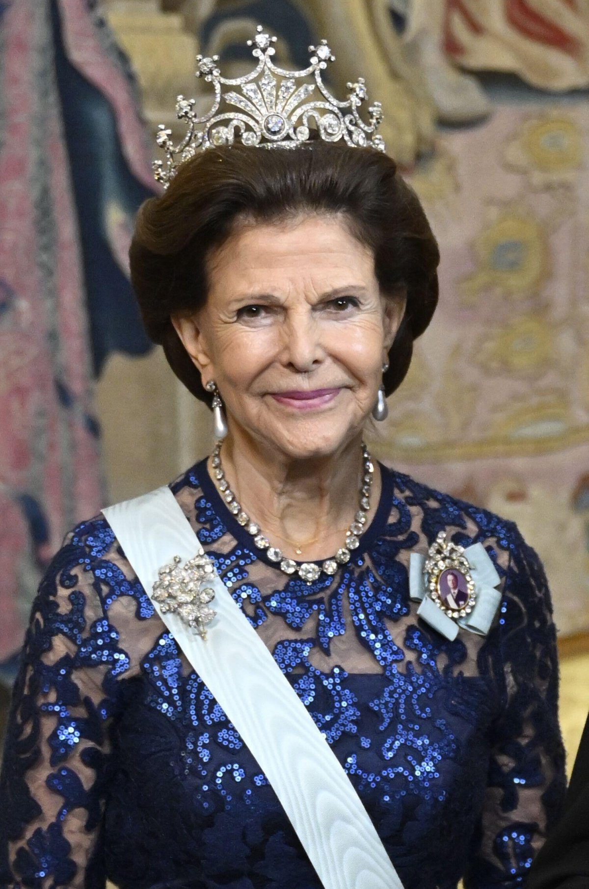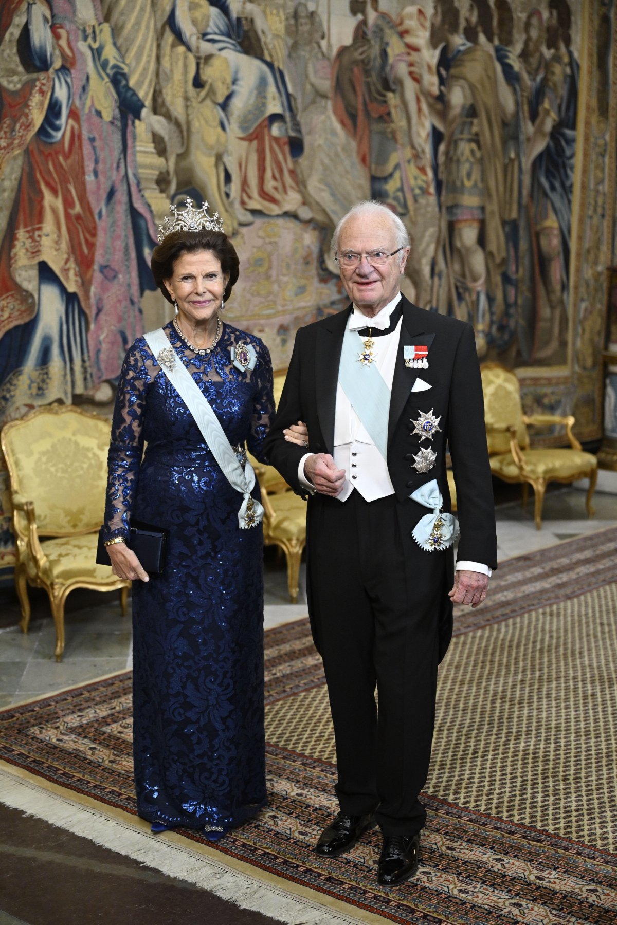 Queen Silvia reached for another gown from her wardrobe archives for tonight’s dinner, wearing a midnight blue gown with a lace and sequin overlay. She’s worn the dress on previous occasions, including an appearance during a state dinner in Estonia in 2023.