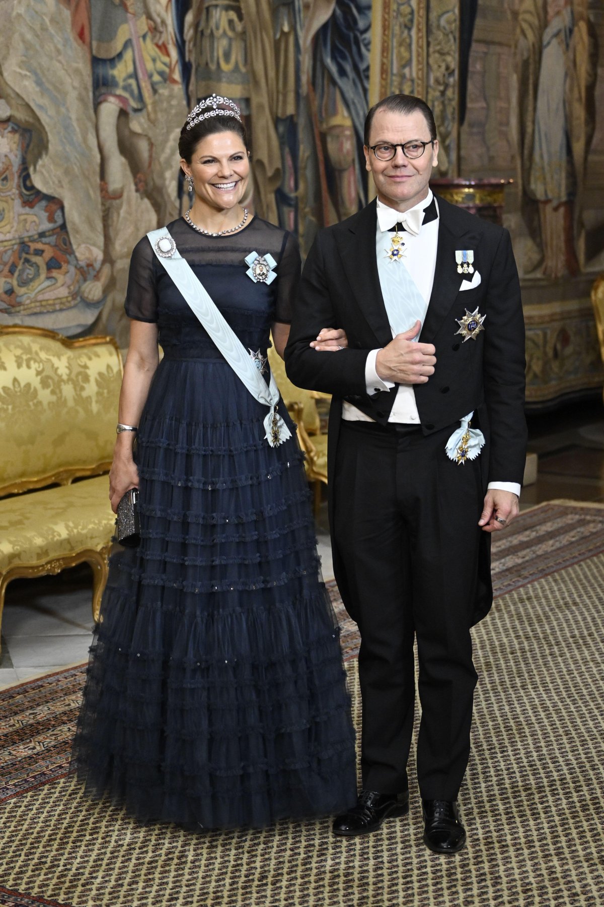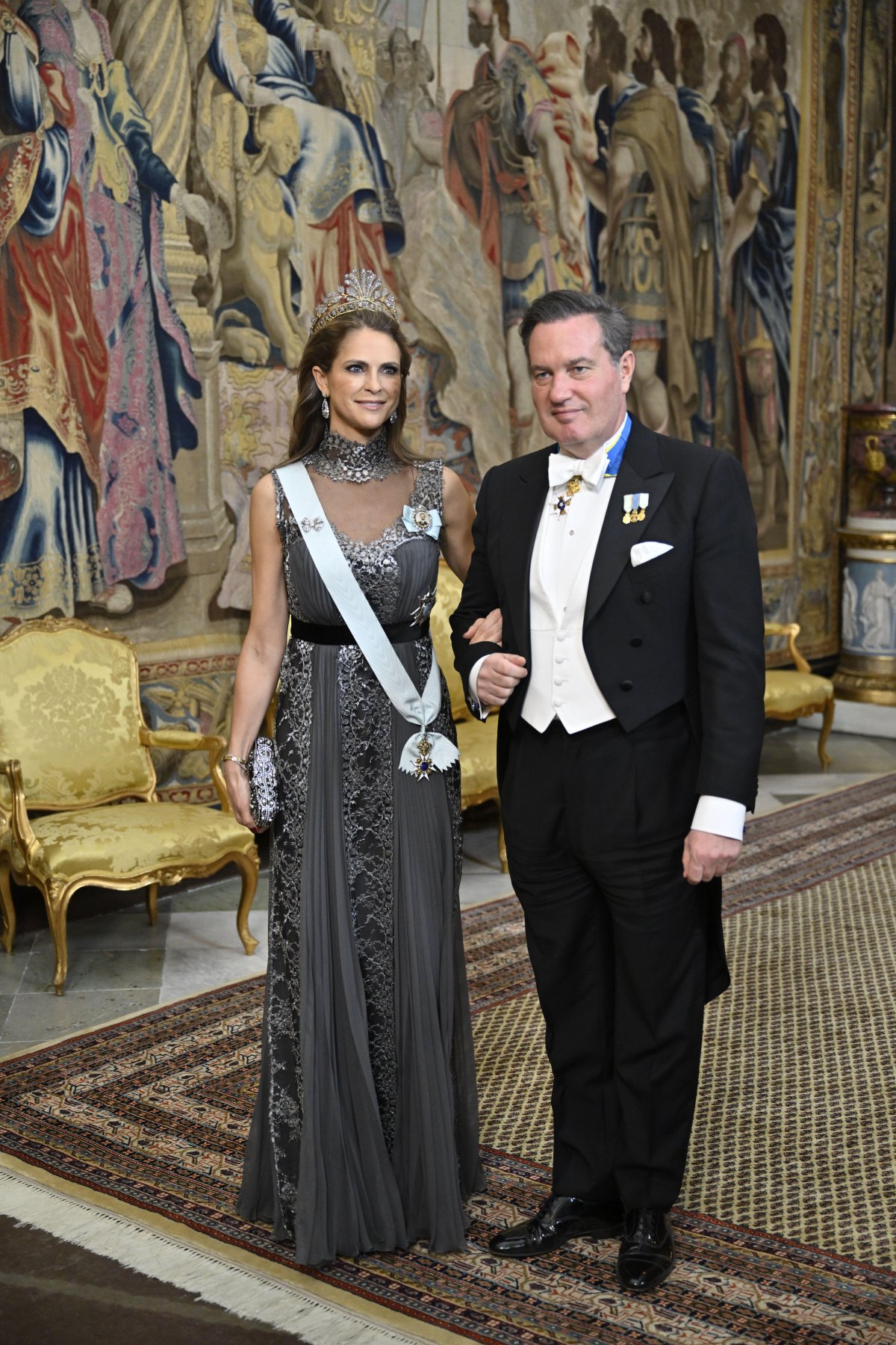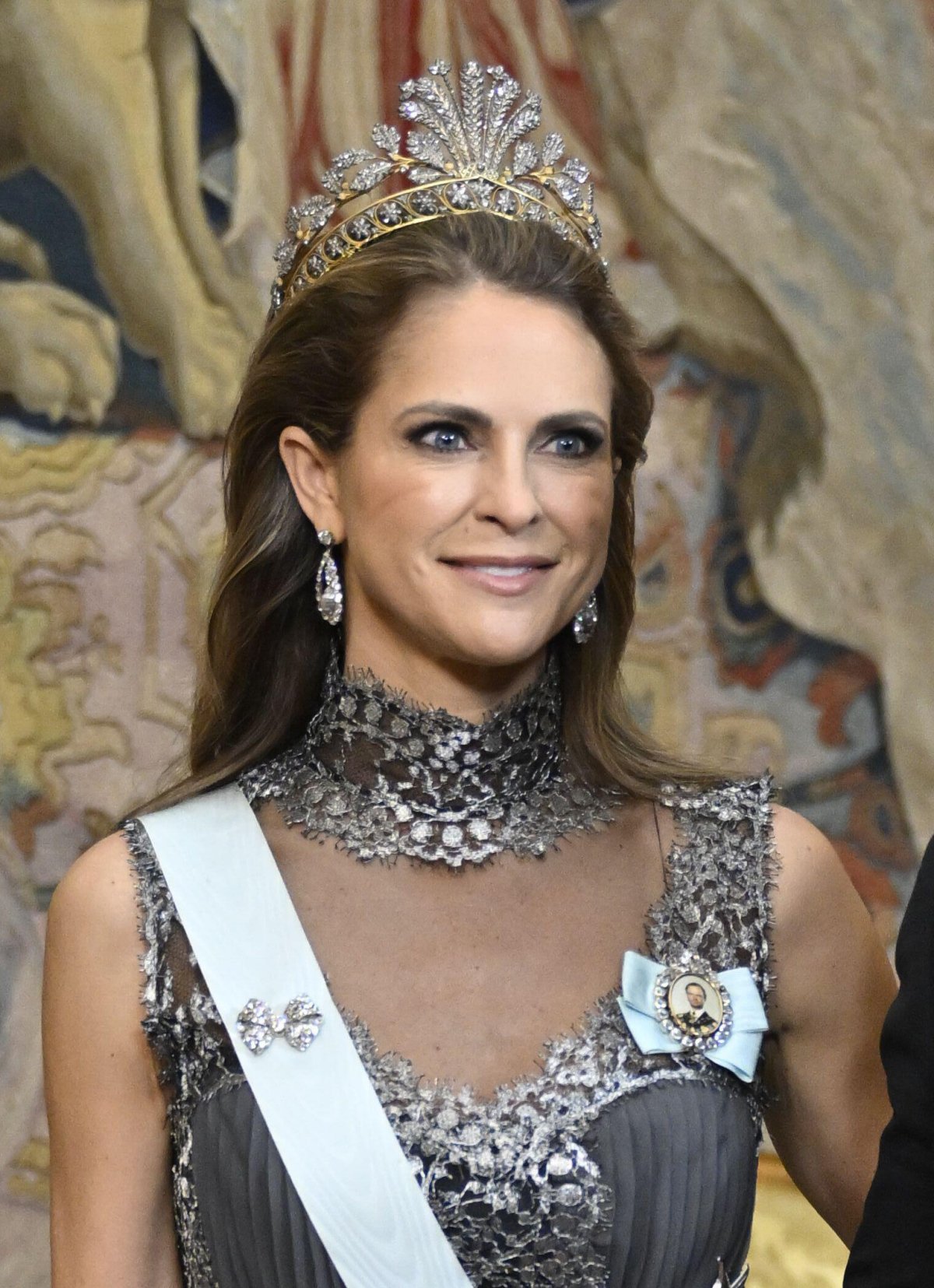 The tiara surprises weren’t done yet. Princess Madeleine arrived for her first King’s Dinner in many years wearing a gray evening gown with lace panels, paired with one of the oldest heirloom tiaras in the family’s jewelry collection.