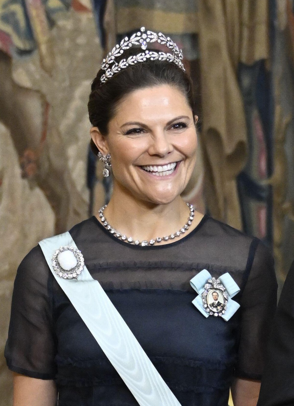 With the tiara, Victoria added the glamorous diamond floral earrings from the family collection, plus a diamond necklace and the diamond and opal cluster brooch that was previously worn by her grandmother, Princess Sibylla.