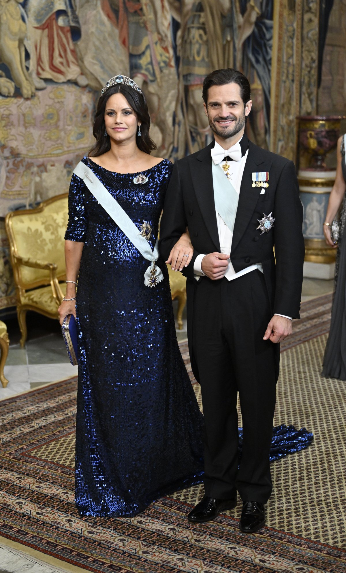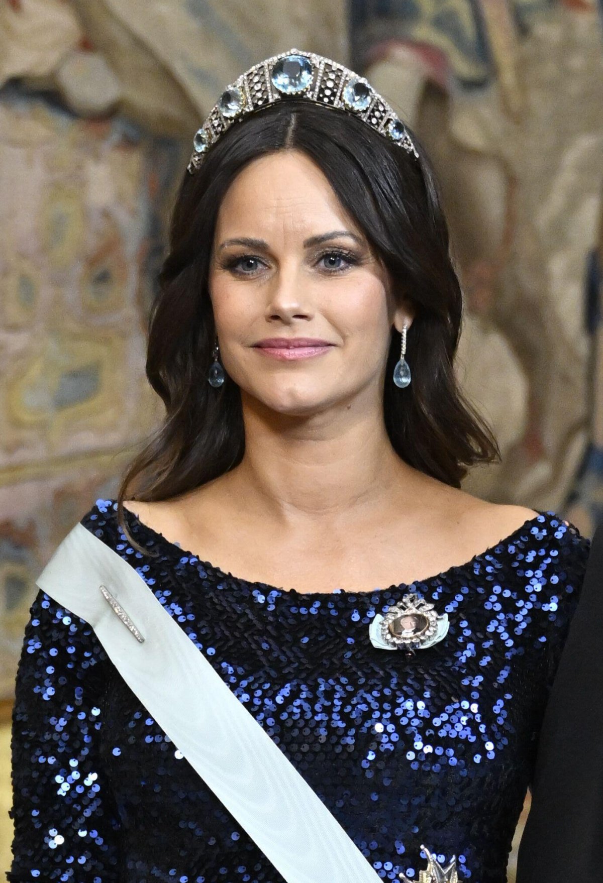 The really exciting jewelry moments began, though, when Princess Sofia arrived on the arm of her husband, Prince Carl Philip. She also wore blue for the occasion: a sequin-covered maternity gown from Pär Engsheden, borrowed from her sister-in-law, Crown Princess Victoria. She memorably wore the same gown for the Nobels in 2011 when she was expecting Princess Estelle.