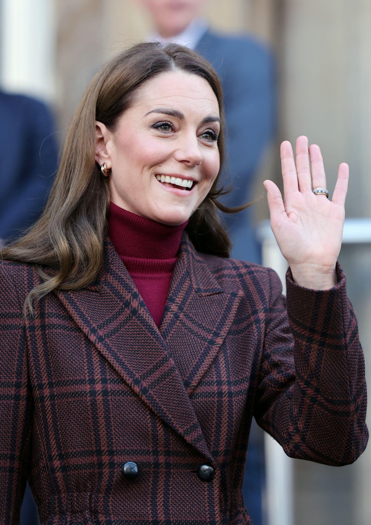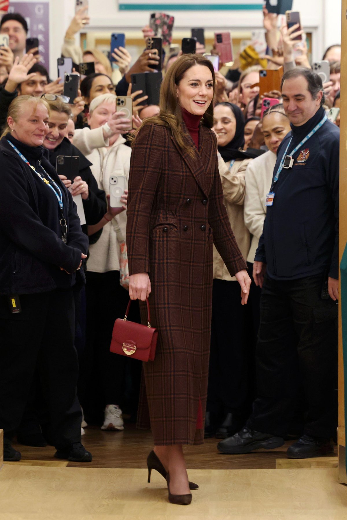 For the hospital visit, Kate was dressed in a long tartan coat over a skirt and sweater in a trendy shade of burgundy, paired with coordinating accessories.