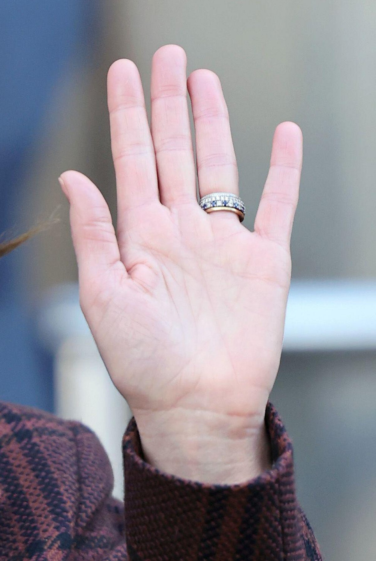 Anyway—back to the Royal Marsden. Instead of her famous sapphire engagement ring, Kate decided to wear the stack of bands that we saw her wear on multiple occasions last year. The stack includes her Welsh gold wedding ring, her diamond eternity band, and two more gem-set rings.