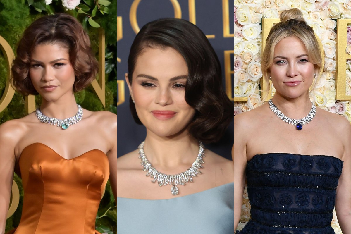 It seems there was something in the air where necklace design is concerned at these Golden Globes, because another iconic jewelry firm crafted a piece that could be a sister to the Bulgari necklaces. It appeared on the actress Selena Gomez, who was doubly nominated for her roles in the television show Only Murders in the Building and the film Emilia Pérez. Like Zendaya, Gomez’s look for the evening—a powder blue Prada dress, ’50s-style waves, and diamonds—was clearly inspired by classic Hollywood actresses.