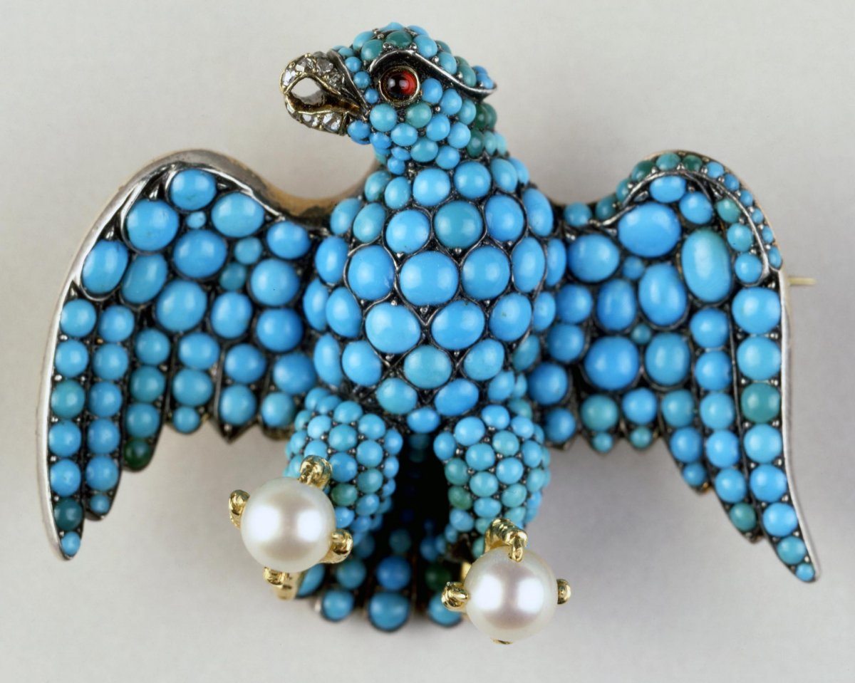 Inside each box was a silver brooch shaped like an eagle, an important German heraldic symbol. The birds were studded with turquoises, with diamonds used to represent the beak and a ruby set as the bird’s eye. In its golden claws, each eagle clutched a pair of round white pearls. The Royal Collection Trust notes that Victoria herself was very involved with the making of the brooches, especially the gemstones chosen for the pieces: “The stones used were all highly symbolic: turquoises and pearls representing true love, rubies for passion and diamonds for eternity.”