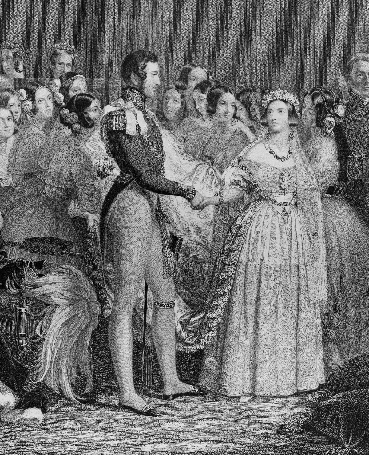 The bridesmaids at Victoria and Albert’s wedding had a slightly more difficult job than anticipated. Because the train was eighteen feet long, and there were twelve young women carrying it, they were scrunched together tightly as they maneuvered the dress down the aisle of the chapel. Short, quick steps replaced longer, more elegant strides as they followed the monarch.
