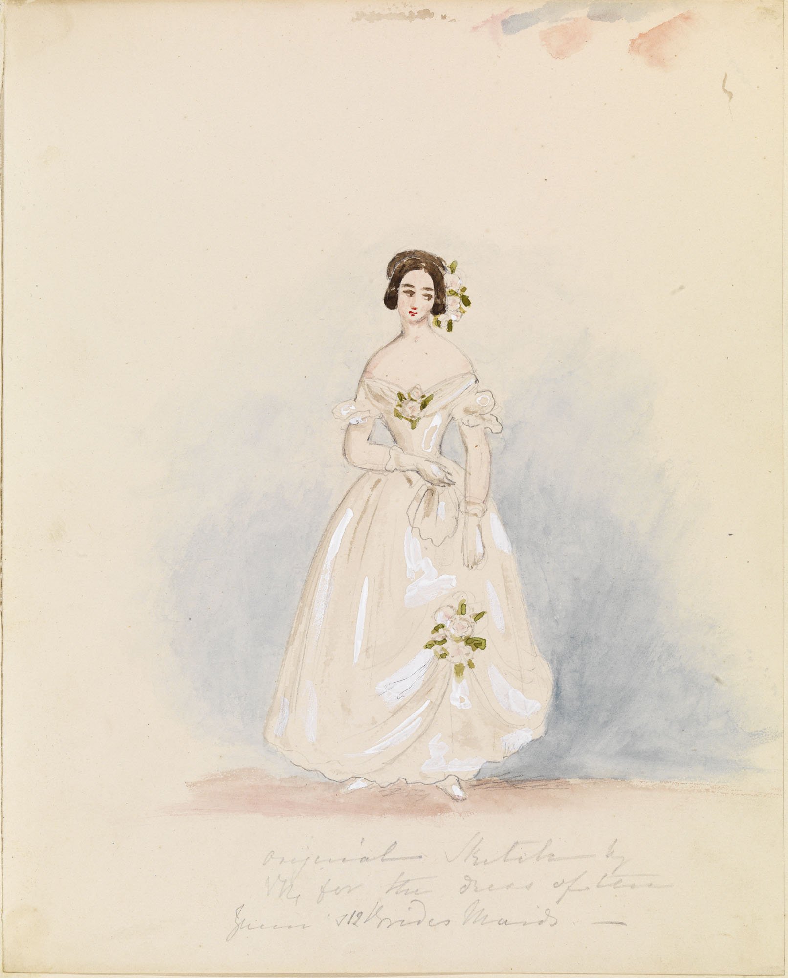 The young women who served as bridesmaids were all the unmarried daughters of aristocrats. Five of them—Lady Caroline Gordon-Lennox, daughter of the 5th Duke of Richmond; Lady Adelaide Paget, daughter of the 1st Marquess of Anglesey; Lady Wilhelmina Stanhope, daughter of the 4th Earl Stanhope; Lady Frances Cowper, daughter of the 5th Earl Cowper; and Lady Mary Grimston, daughter of the 1st Earl of Verulam—had already had experience shepherding Victoria’s regal garments when they served as Maids of Honour during her coronation two years earlier.