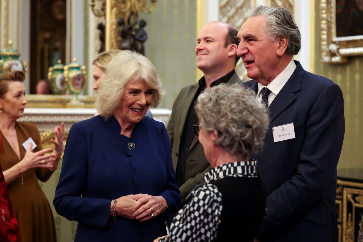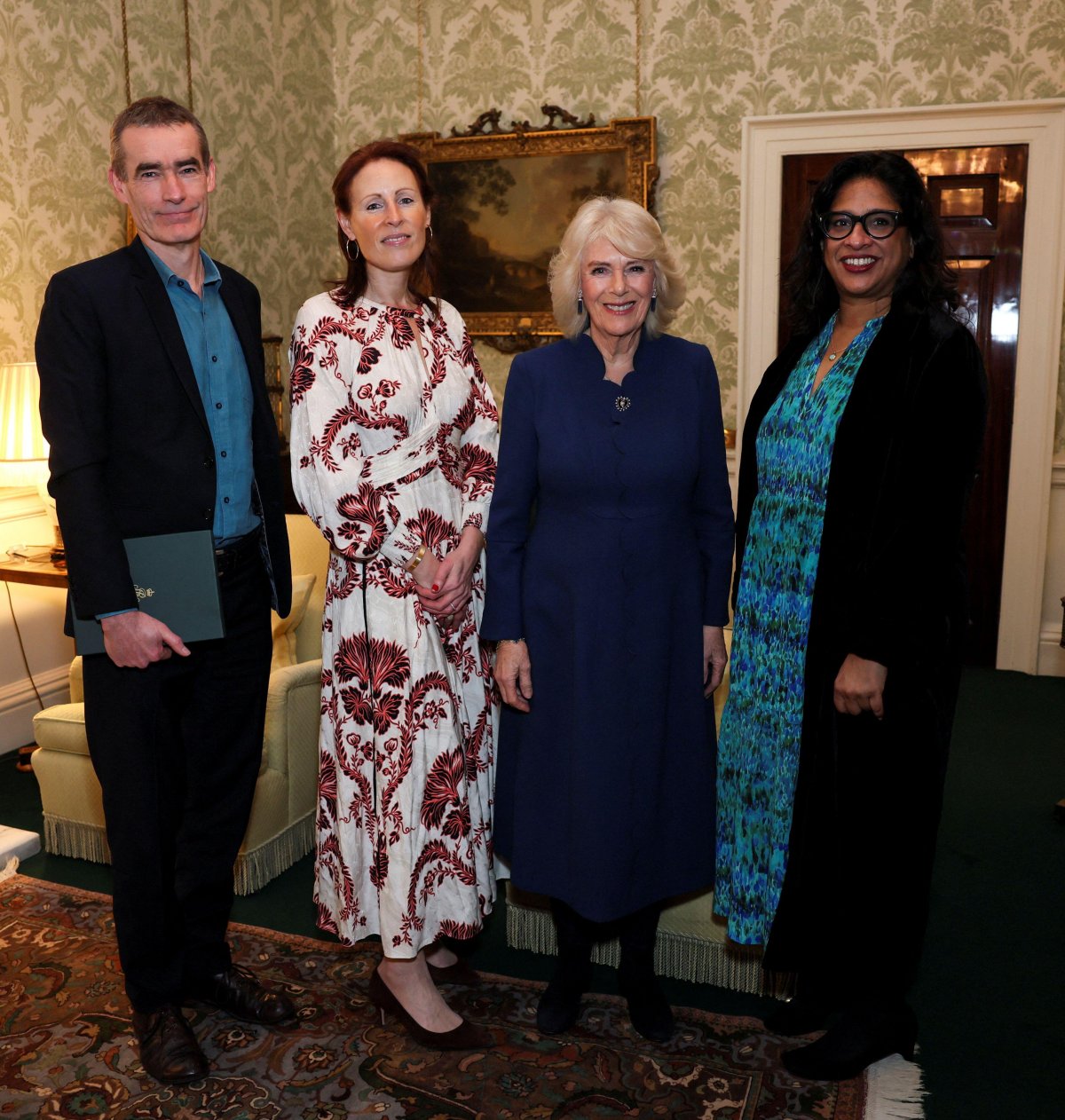 Queen Camilla welcomed representatives from the National Theatre to Buckingham Palace in London for a reception on Tuesday. The event celebrated the work that the institution has done on stage, on screen, and in schools. Here, she poses for an official photo with director and co-chief executive Rufus Norris, director designate Indhu Rubasingham, and executive director and co-chief executive Kate Varah.