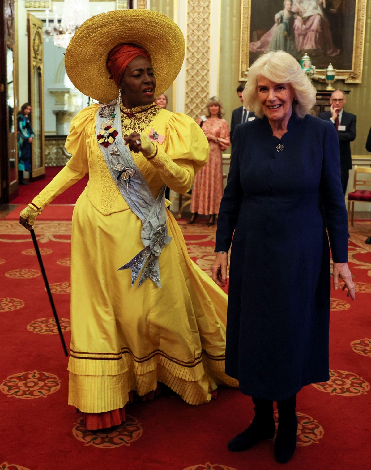 For the reception, Queen Camilla wore a navy ensemble, which looked queenly but didn’t even try to detract from some of the fabulous costumes on display, including this royal-inspired one worn by the actress Sharon D. Clarke. She recently wore this ensemble to play Lady Bracknell in a National Theatre production of The Importance of Being Earnest.