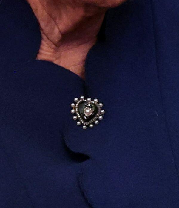 I don’t think we’ve learned any provenance information about Camilla’s brooch yet, but it calls to mind two other royal examples. One of them belongs to Queen Margrethe II of Denmark. Her black enamel and diamond heart brooch is a memorial pin made in 1917 in memory of her maternal great-grandmother, the Duchess of Connaught. Margrethe often wears the brooch for family funerals and other somber events.