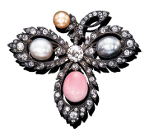 Queen Mary owned several pieces of jewelry with pink conch pearls, one of which definitely was made earlier in time. This diamond clover brooch, which is set with a pink conch pearl, a white pearl, a gray pearl, and a golden pearl, was reportedly made around 1865.
