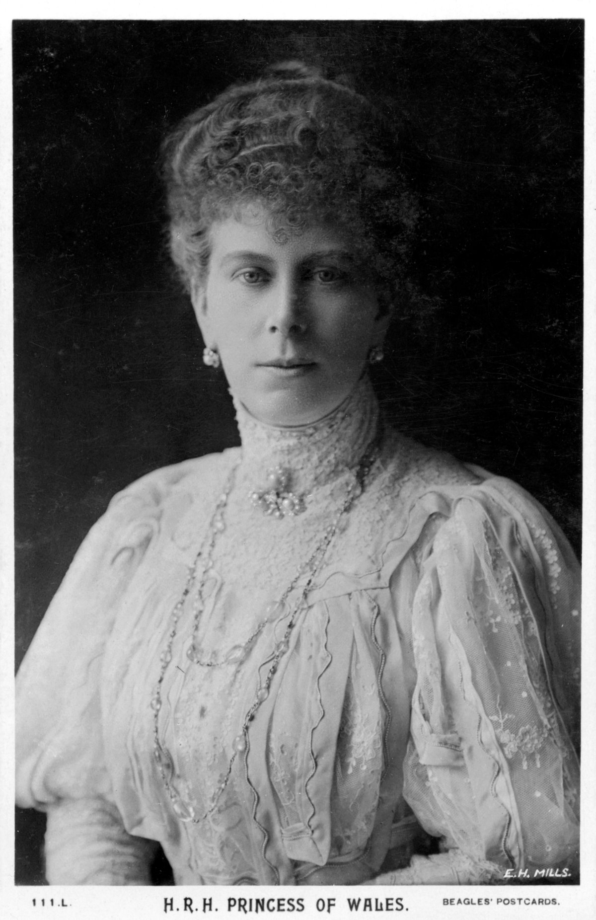 The brooch was in Mary’s collection by the turn of the twentieth century. She wore it, pinned at the neck of her bodice, for a portrait photograph taken by E.H. Mills during her tenure as Princess of Wales. The picture was published as a postcard, and the National Portrait Gallery collection includes another photograph from the same session.