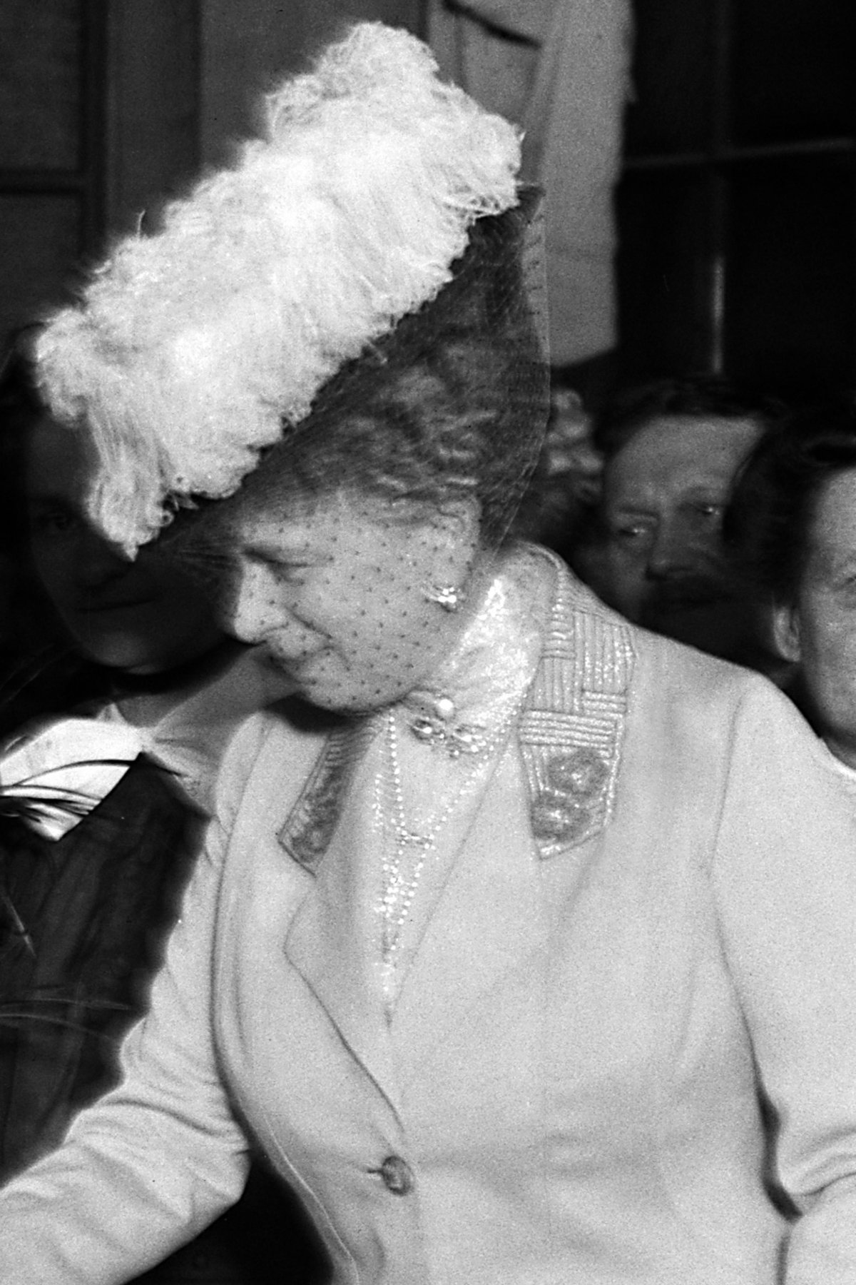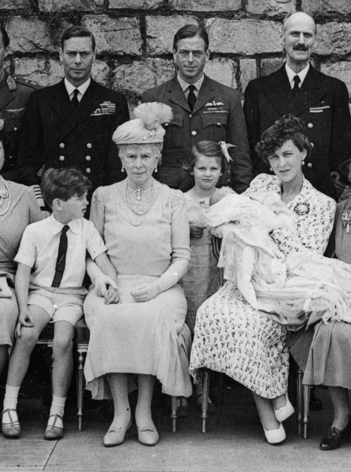 Mary also wore the two brooches together for an important family occasion a few years later: the christening of her grandson, Prince Michael of Kent, in the private chapel at Windsor Castle on August 4, 1942. She again has the bar brooch pinned to her hat and the pendant brooch pinned at the neck of her bodice.