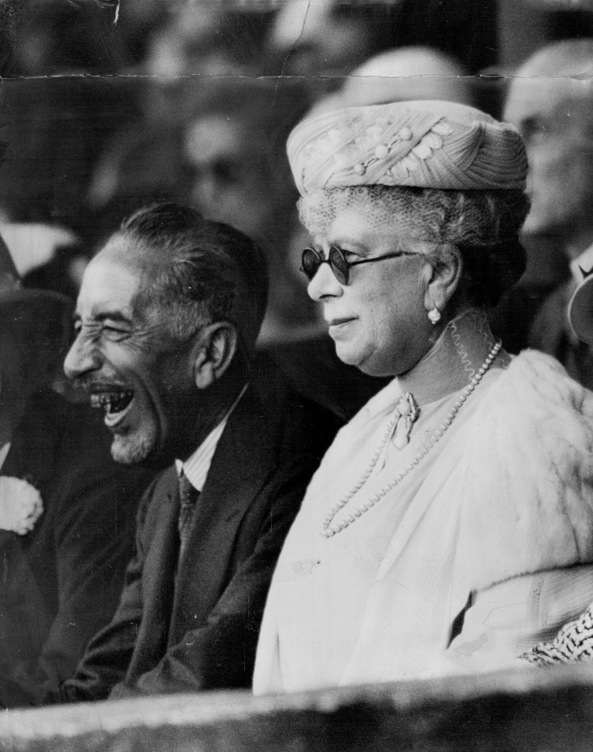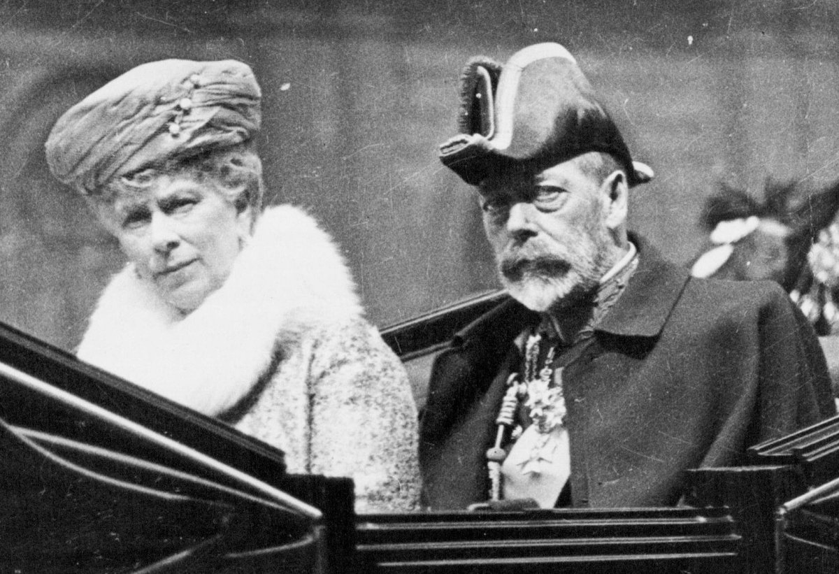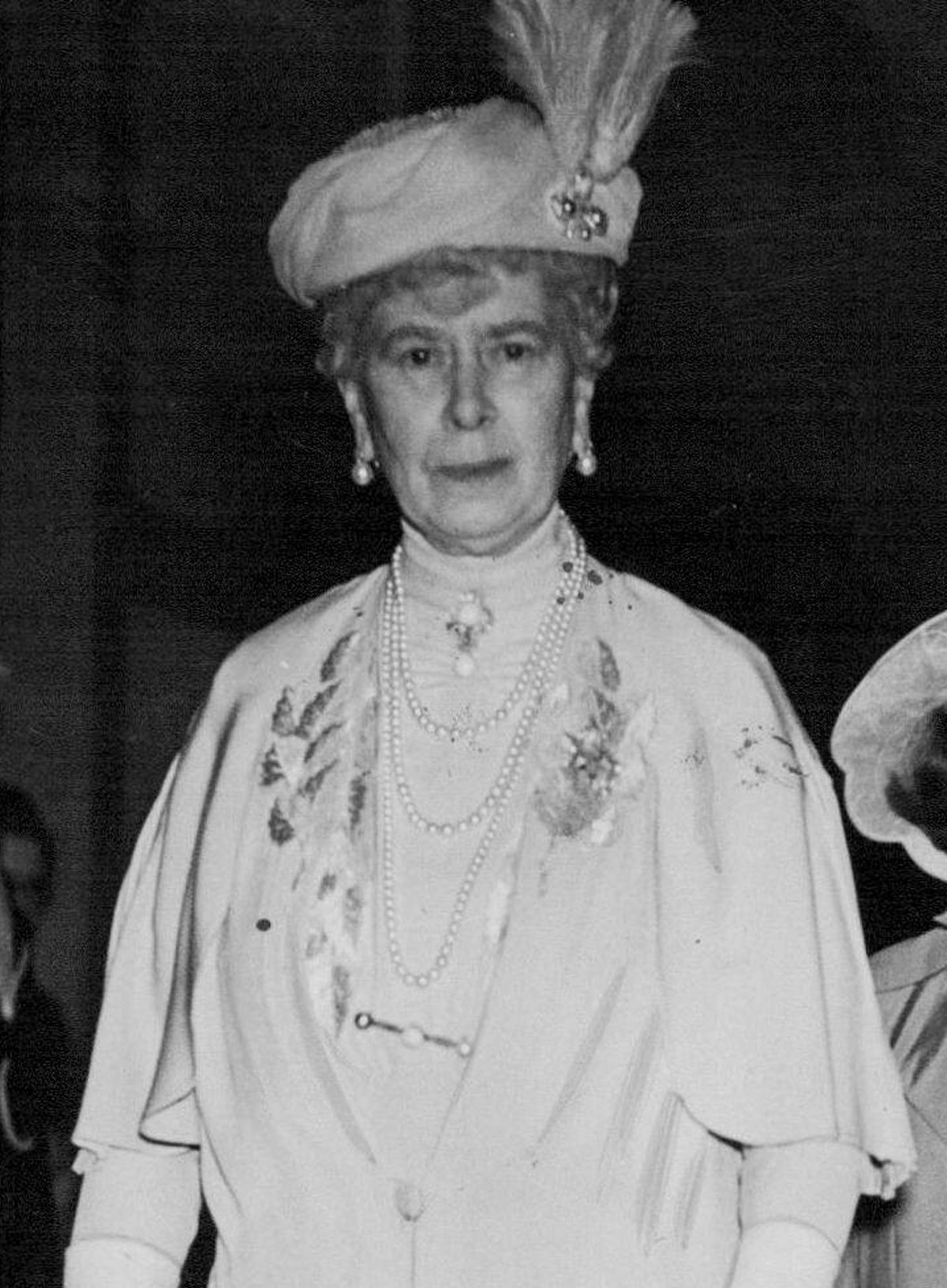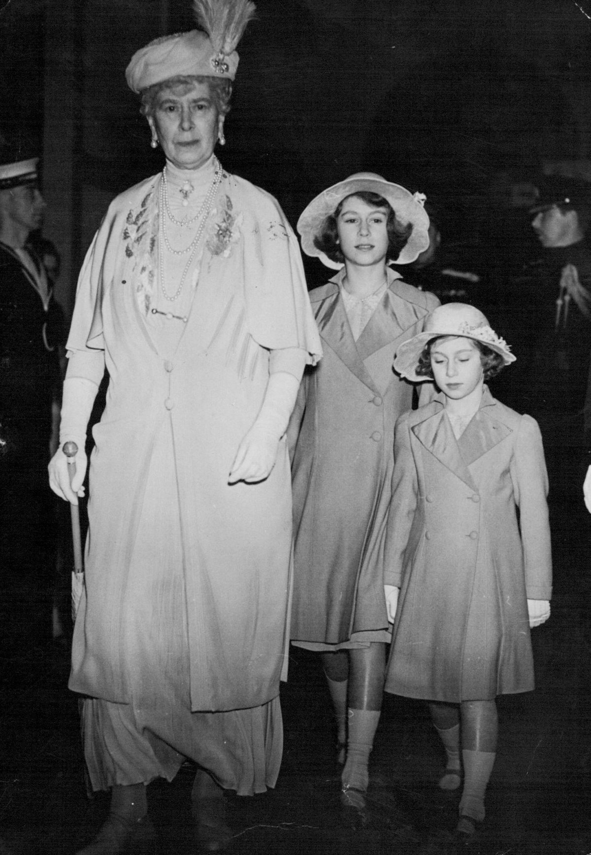On at least one occasion, Mary wore all three of her conch pearl jewels together. This photograph was taken as she arrived at the Royal Tournament, a military pageant and tattoo, at the Olympia Exhibition Centre with her granddaughters, Princess Elizabeth and Princess Margaret. The event was held on May 22, 1939, just a few months before the start of World War II.