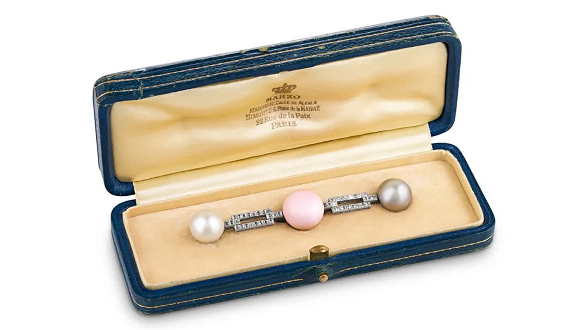 It’s rare that heirloom-quality royal jewelry becomes available for purchase, but right now, one of Queen Mary’s jewels is up for sale: a fascinating diamond and multi-colored pearl bar brooch.