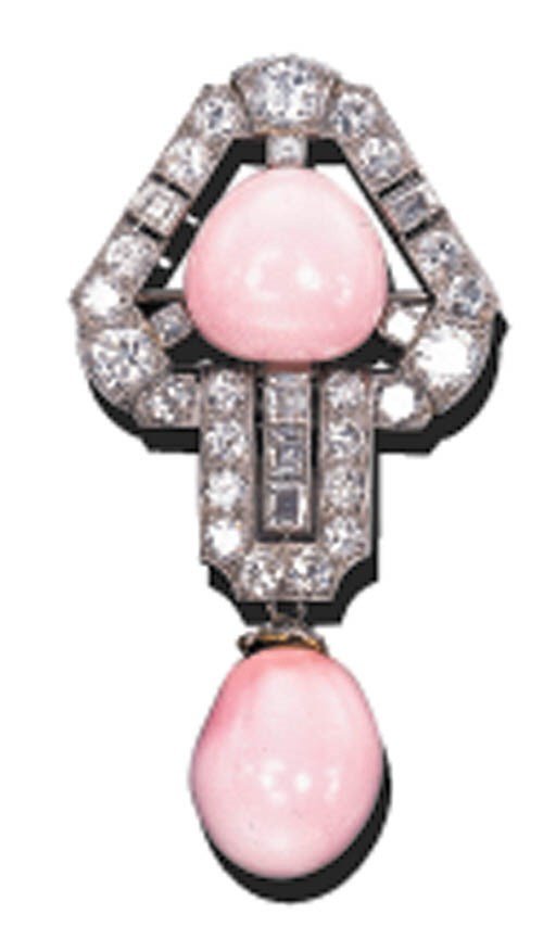 There was also another, more modern diamond and conch pearl brooch in Mary’s collection by the middle of the 1920s. This one features a very Art Deco diamond design surrounding a pink conch pearl, with a second conch pearl used as a pendant drop.