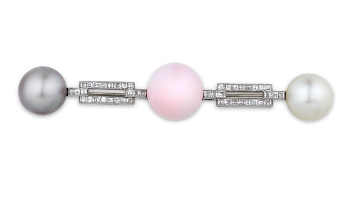 The brooch is being sold by M.S. Rau, a fine arts and antiques gallery located in New Orleans. The company also has a jewelry boutique with a whole range of interesting antique pieces for sale. Among them is this diamond brooch, which is set with three pearls: a white South Seas pearl, a black Tahitian pearl, and a rare pink conch pearl.