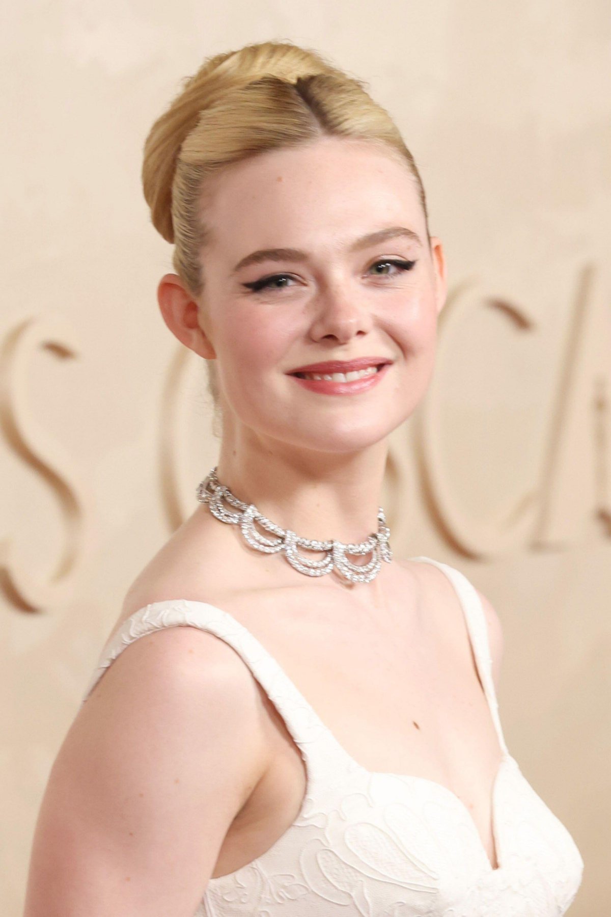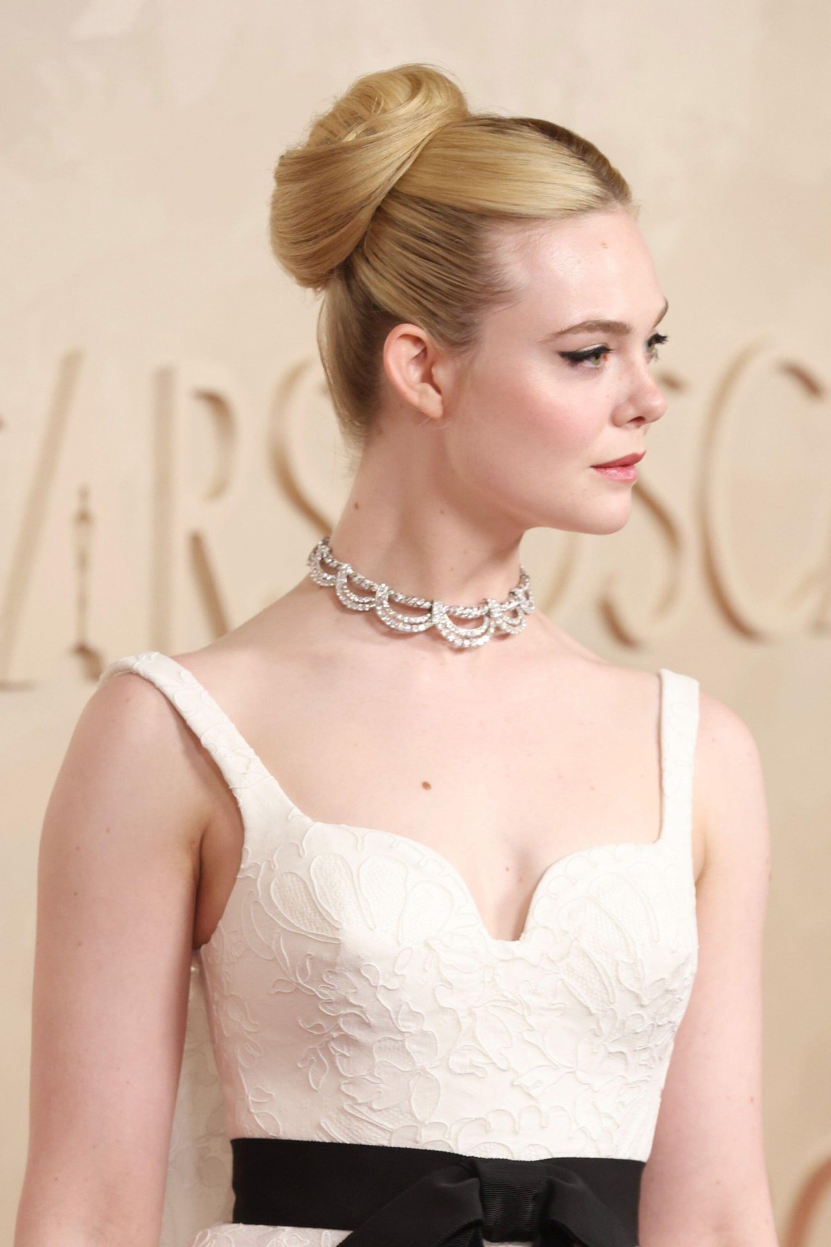 Fanning and her stylist, Samantha McMillen, added more than a touch of sparkle to the ensemble with some fabulous vintage Cartier diamonds, including a choker-style necklace that dates to 1958.