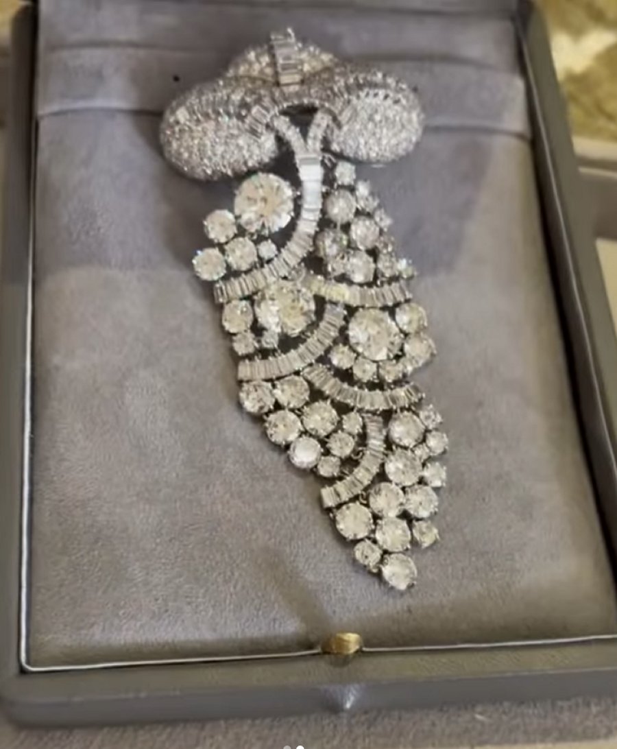 The good people at Fred Leighton shared a video of Tazewell’s brooch on their Instagram account. Above is a screenshot from that video, showing some of the grapevine-inspired details of the jewel. The piece, per the retailer, is a vintage jewel from the 1950s—something evident in the combination of baguette- and round-cut diamonds set in the piece.