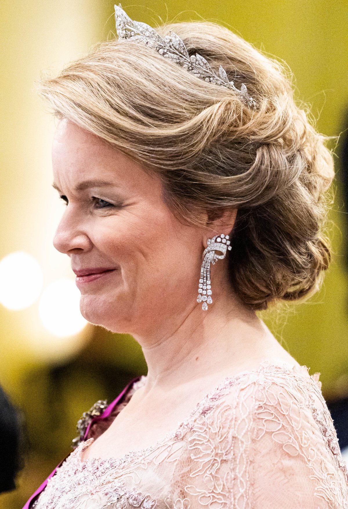 With the dress, Queen Mathilde wore jewelry primarily set with diamonds. In her hair, she nestled the Brabant Laurel Wreath Tiara. Mathilde received the antique jewel as a wedding present in 1999 from a group of Belgian aristocrats. The tiara was made by Hennel & Sons, an English firm, in 1912, and it can also be taken off of its tiara frame and worn as a necklace.