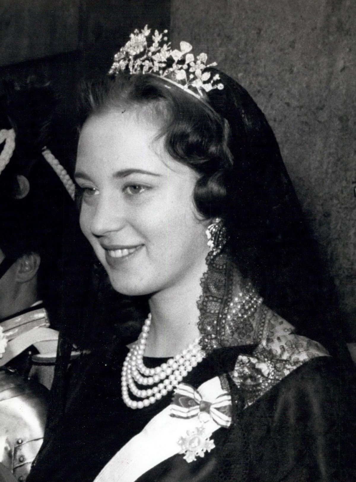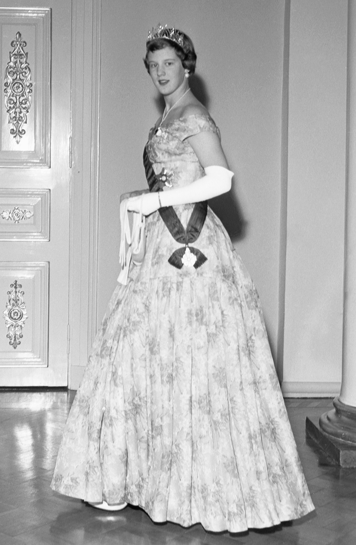 To provide a tiara for her third daughter, Princess Anne-Marie, Queen Ingrid turned to her own jewelry box. She had inherited a suite of diamond and pearl jewels from her grandmother, Queen Victoria of Sweden, that included a pair of earrings, a small brooch, and a large corsage ornament.