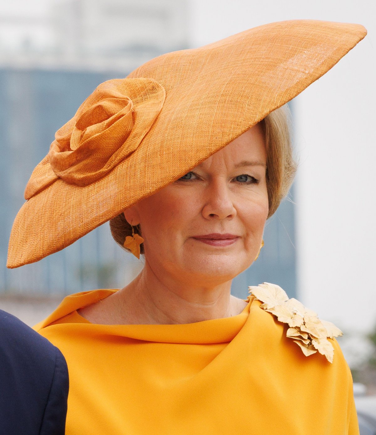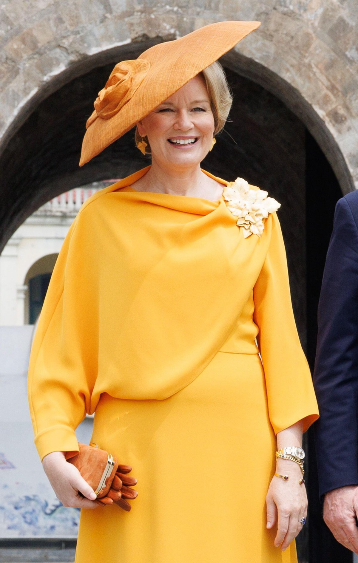 For the welcome ceremonies, Queen Mathilde wore a golden yellow dress with a coordinating hat and gold jewelry accessories. Per UFO No More, the hat was made by Fabienne Delvigne, but the rest of the ensemble, including the earrings and brooch, come from Natan.