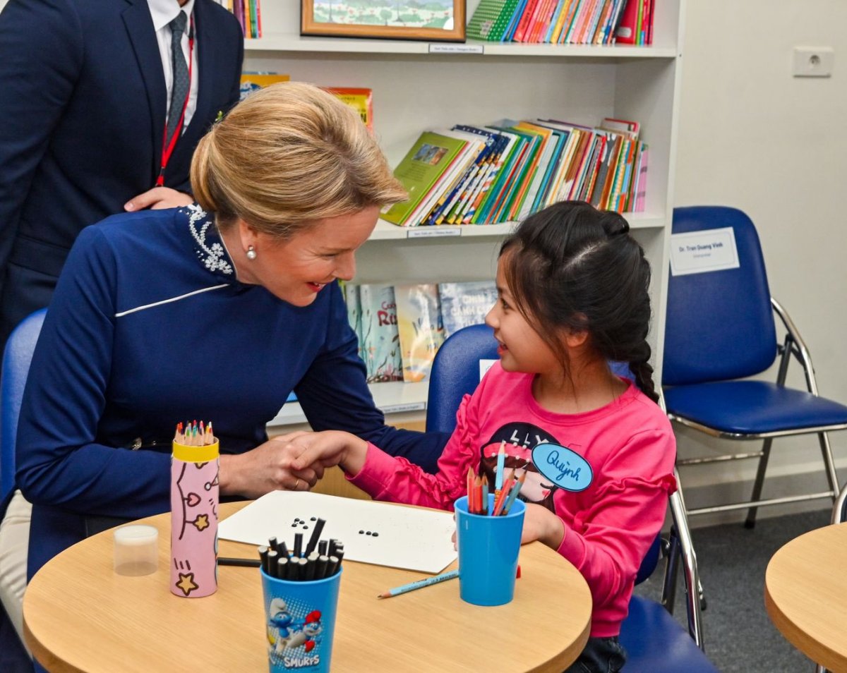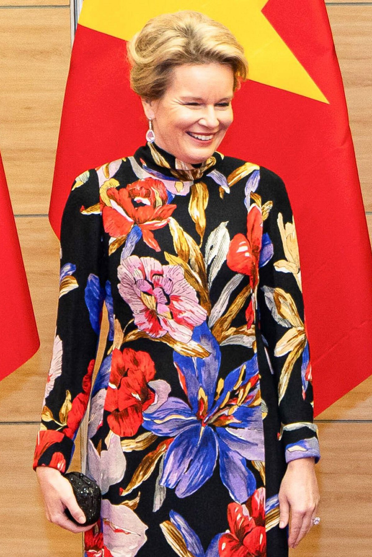 In the afternoon, Queen Mathilde changed into a Vietnamese-inspired outfit for a visit to the National Hospital of Pediatrics in Hanoi, an institution that cooperates with Belgium’s Queen Fabiola Children’s University Hospital. She echoed the white floral embroidery on the navy dress by wearing her diamond and pearl button earrings.