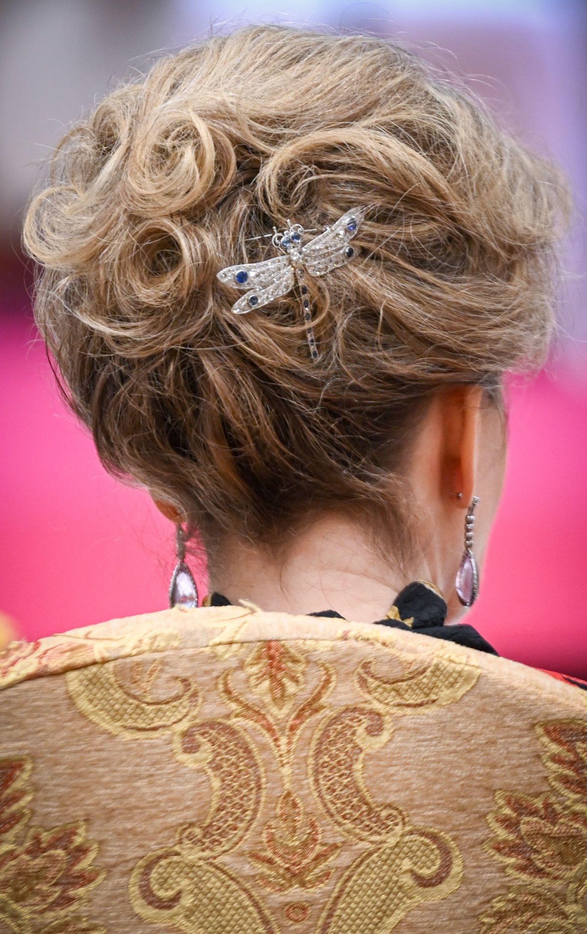 For state dinners like this one, tiaras are generally off the menu. But Mathilde usually finds a way to sneak in a little sparkle in her hair anyway. Delightfully, she added a diamond and sapphire dragonfly brooch from her personal jewelry collection to her updo on Tuesday evening. The brooch, which was made in the 1920s, was also purchased from an auction in 2018.