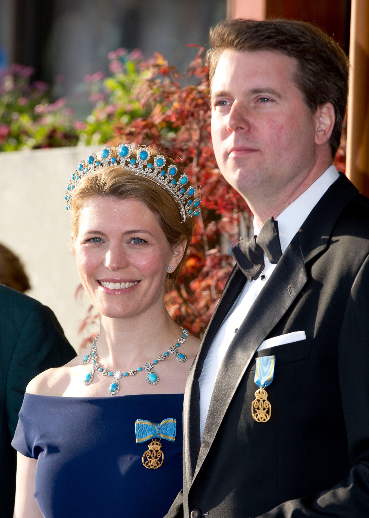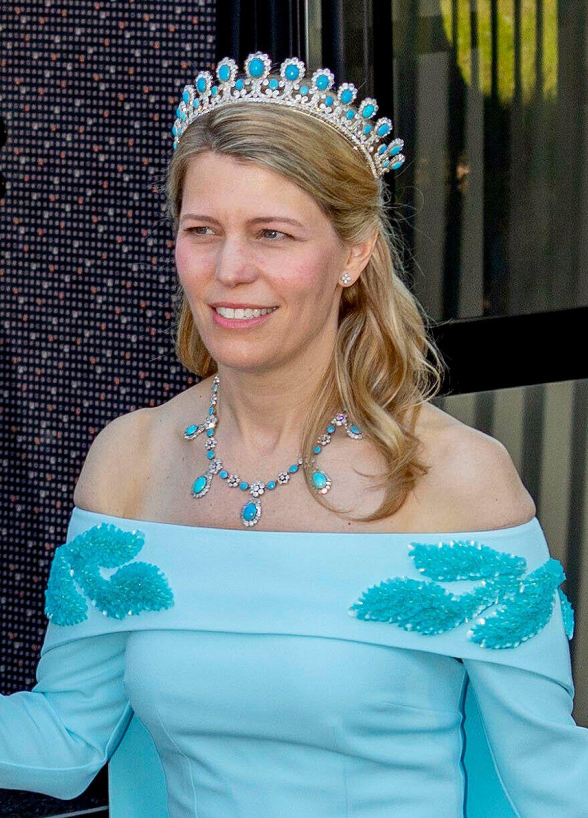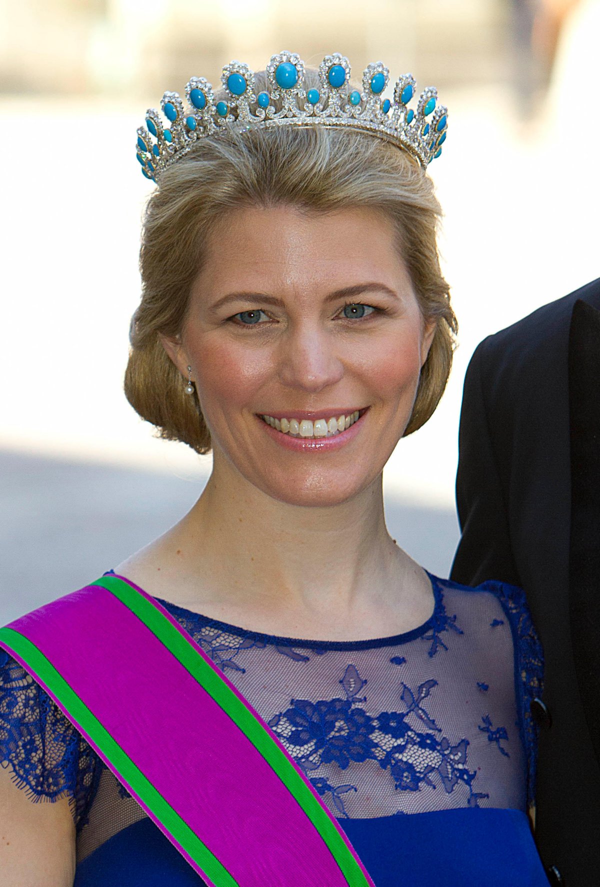 In recent years, the diamond and turquoise suite has primarily been worn by Prince Andreas’s daughter-in-law, the American-born Princess Kelly. She’s often one of the most vibrant figures at family weddings and celebrations, because she pairs the turquoises and the purple and green sash of the family order with gowns in bright shades of blue. Here, she wears an electric blue dress with the jewels and decoration at the wedding of Princess Madeleine of Sweden in June 2013.