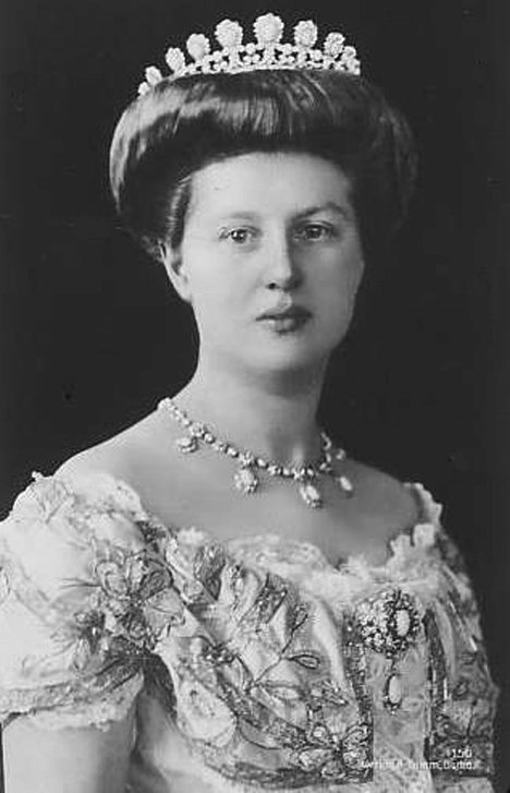 Over the years, the family has managed to retain a few pieces of important jewelry that belonged to Andreas’s grandmother, Victoria Adelheid. Among the collection is a parure of diamond and turquoise jewelry that includes a tiara, a necklace, a pair of earrings, and a brooch. Above, Victoria Adelheid wears parts of the suite in a formal portrait, including the tiara, which is a wide, open diadem that fit well with the piled-up hairstyles of the turn of the 20th century.
