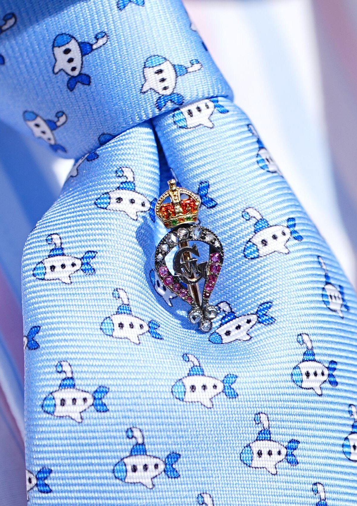 King Charles III wore a morning suit with an umbrella and top hat for the party. The pool photographer at the event, the excellent Aaron Chown, brought us some spectacular close-ups of royal jewelry pieces worn for the garden party. Here, you’ll be able to clearly see that the King wore a tie pin, set with diamonds, rubies, and enamel, featuring the cypher of his beloved grandfather, King George VI. He used the pin to secure a cheeky tie festooned with cartoon submarines.