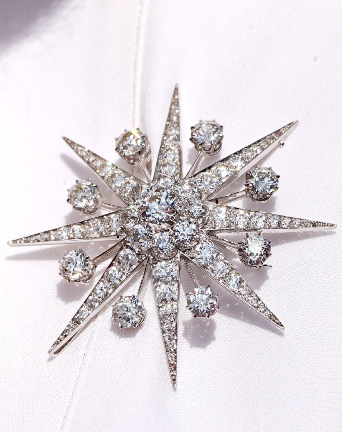 How’s this for a great close-up? This is the Jardine Star Brooch, a nineteenth-century jewel that was particularly treasured by the late Queen Elizabeth II. The brooch arrived in her collection in the 1980s, reportedly as a bequest from a Lady Jardine, and she wore it regularly for the rest of her life.