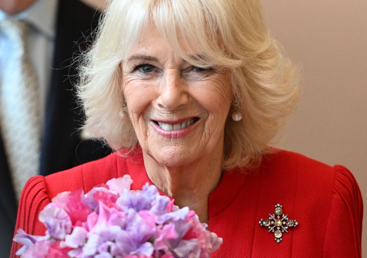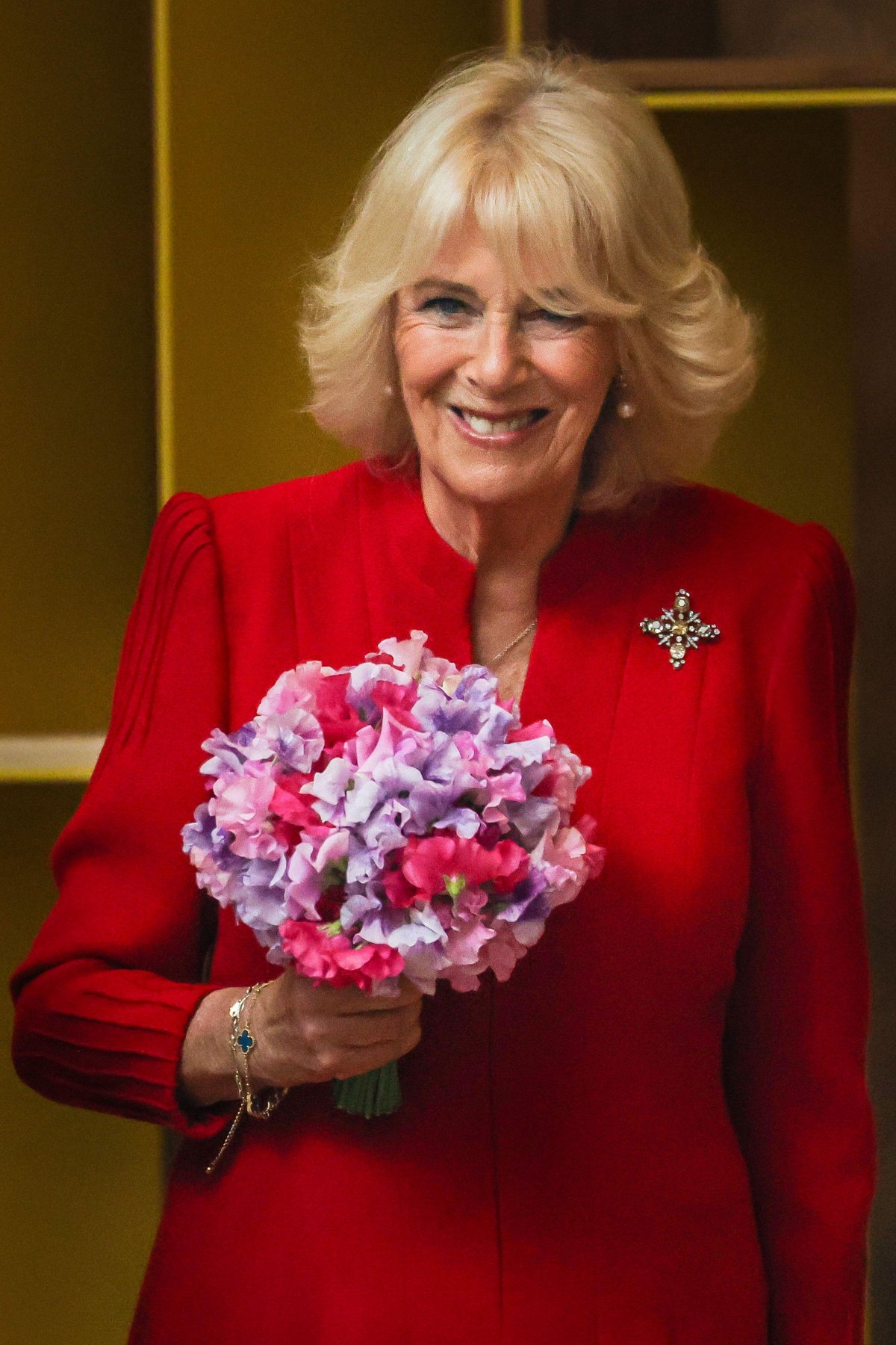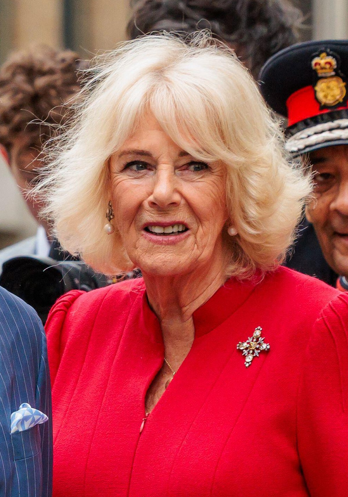 For the gallery visit and portrait unveiling, Queen Camilla wore a bright red Fiona Clare dress accessorized with her favorite diamond and pearl drop earrings, her usual necklaces and bracelets, and a special brooch with an interesting and evolving royal provenance.