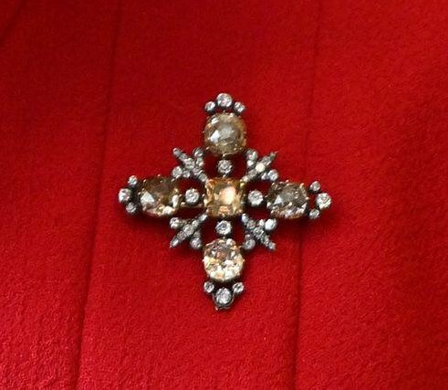 The brooch is in the shape of an embellished cross and is set with white and yellow gemstones. Though Buckingham Palace has (confusingly) referred to the brooch as the Raspberry Pip Brooch, the cross shape of the jewel appears to be a more immediately recognizable design motif.