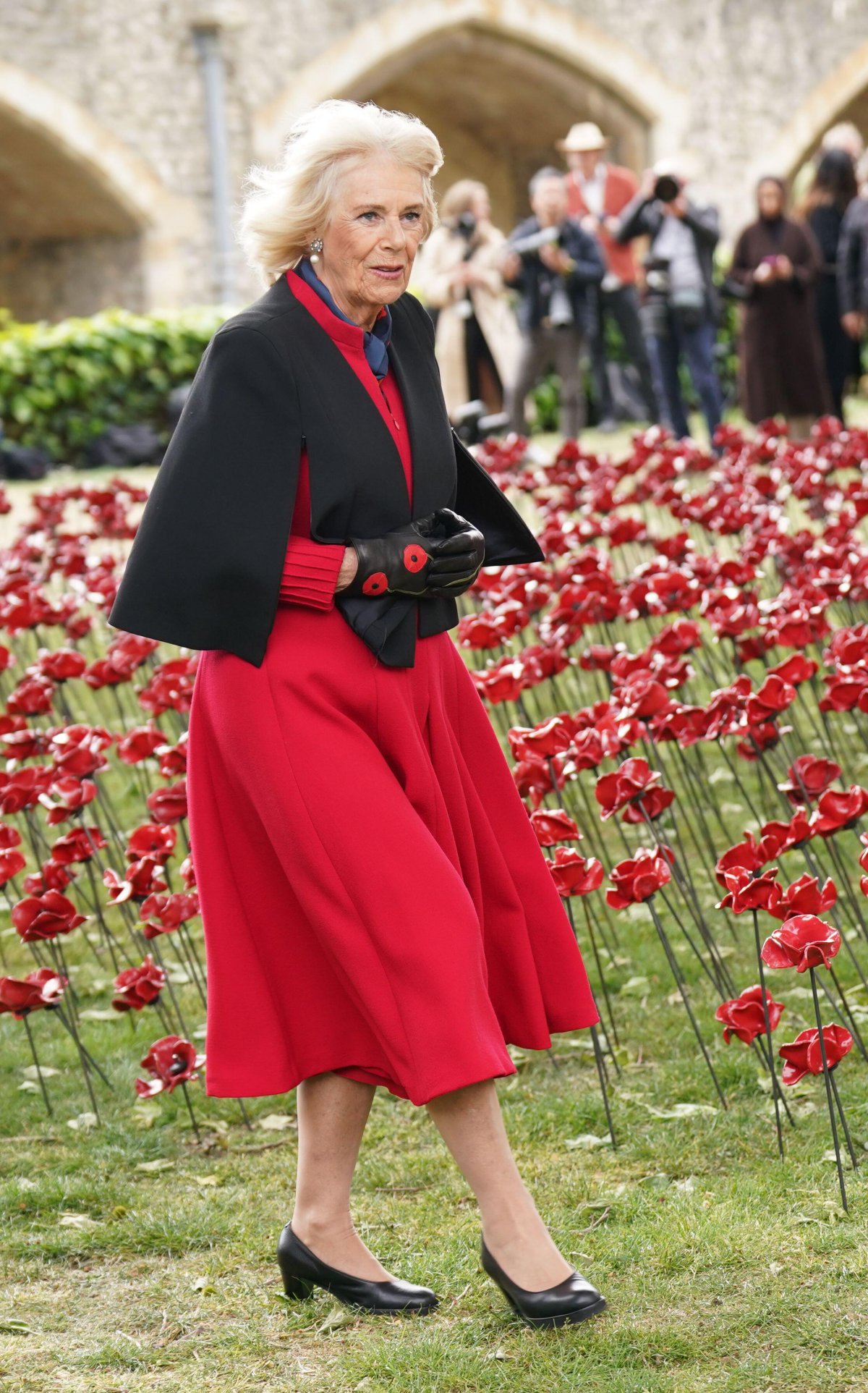 For the visit, during which she “planted” one of the poppies, Camilla wore the same dress and jewels from the National Gallery visit, but she switched out her shoes and added a black cape jacket, as well as a scarf and gloves, both featuring poppy decorations.