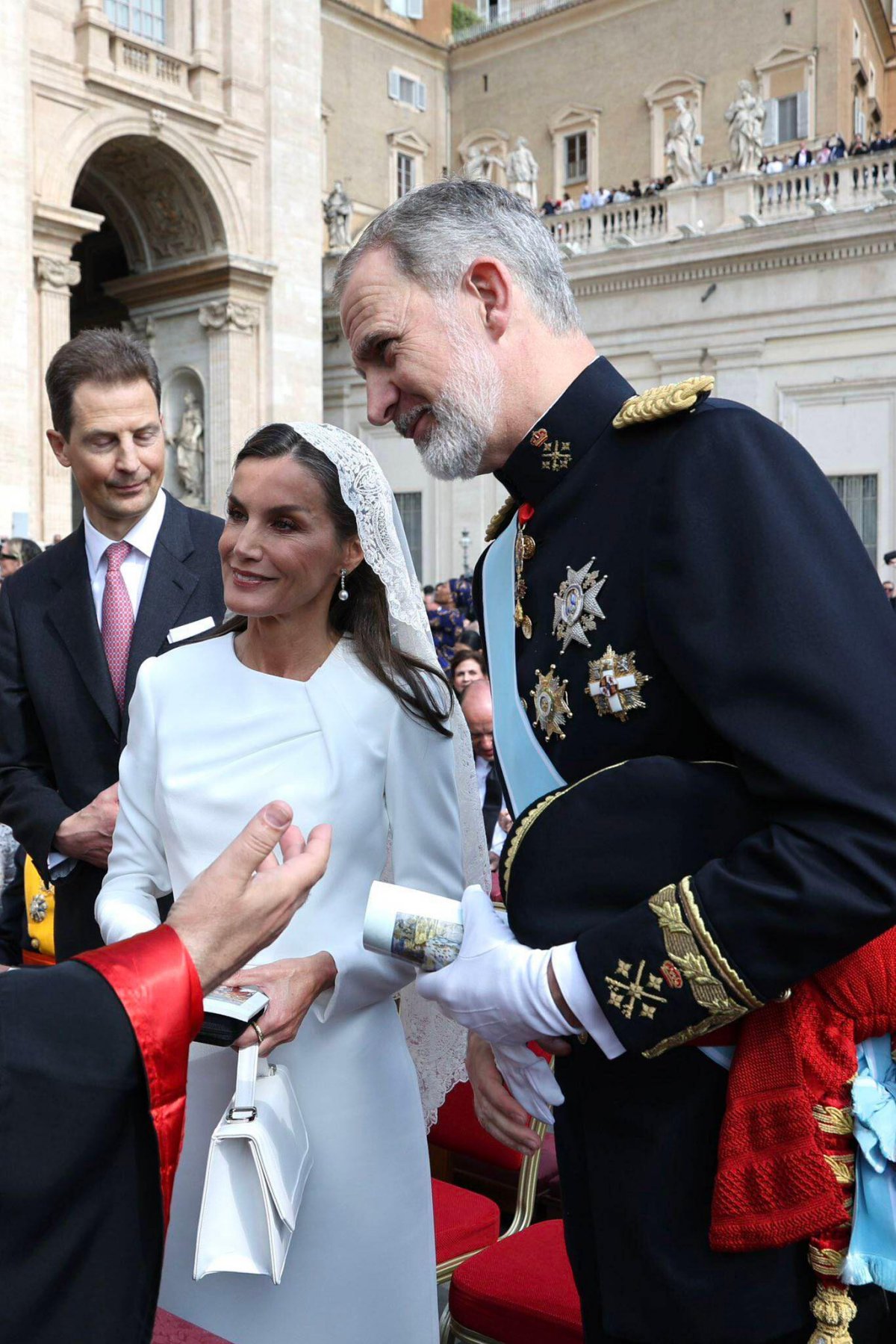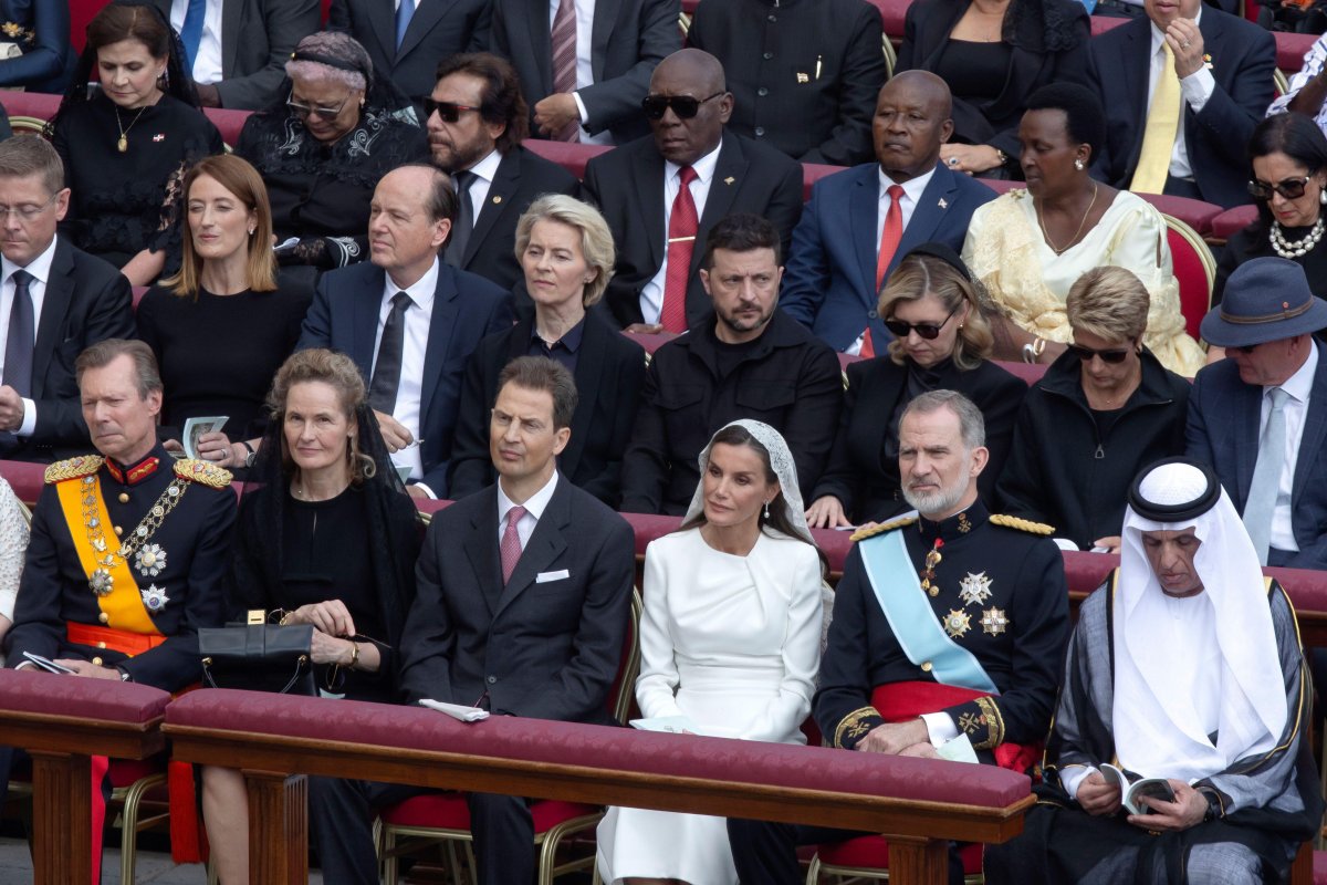 King Felipe VI and Queen Letizia of Spain were among the first royals to greet Pope Leo inside the basilica. King Felipe was in full uniform with orders and decorations for the inauguration mass, while Queen Letizia wore a white dress and veil. She’s one of a select group of Catholic royal women who have historically been granted the privilege du blanc—the right to wear white during papal audiences. These include the spouses of the sovereigns of Belgium, Luxembourg, Monaco, and Spain, as well as princesses from the House of Savoy, the dynasty that once ruled Italy.