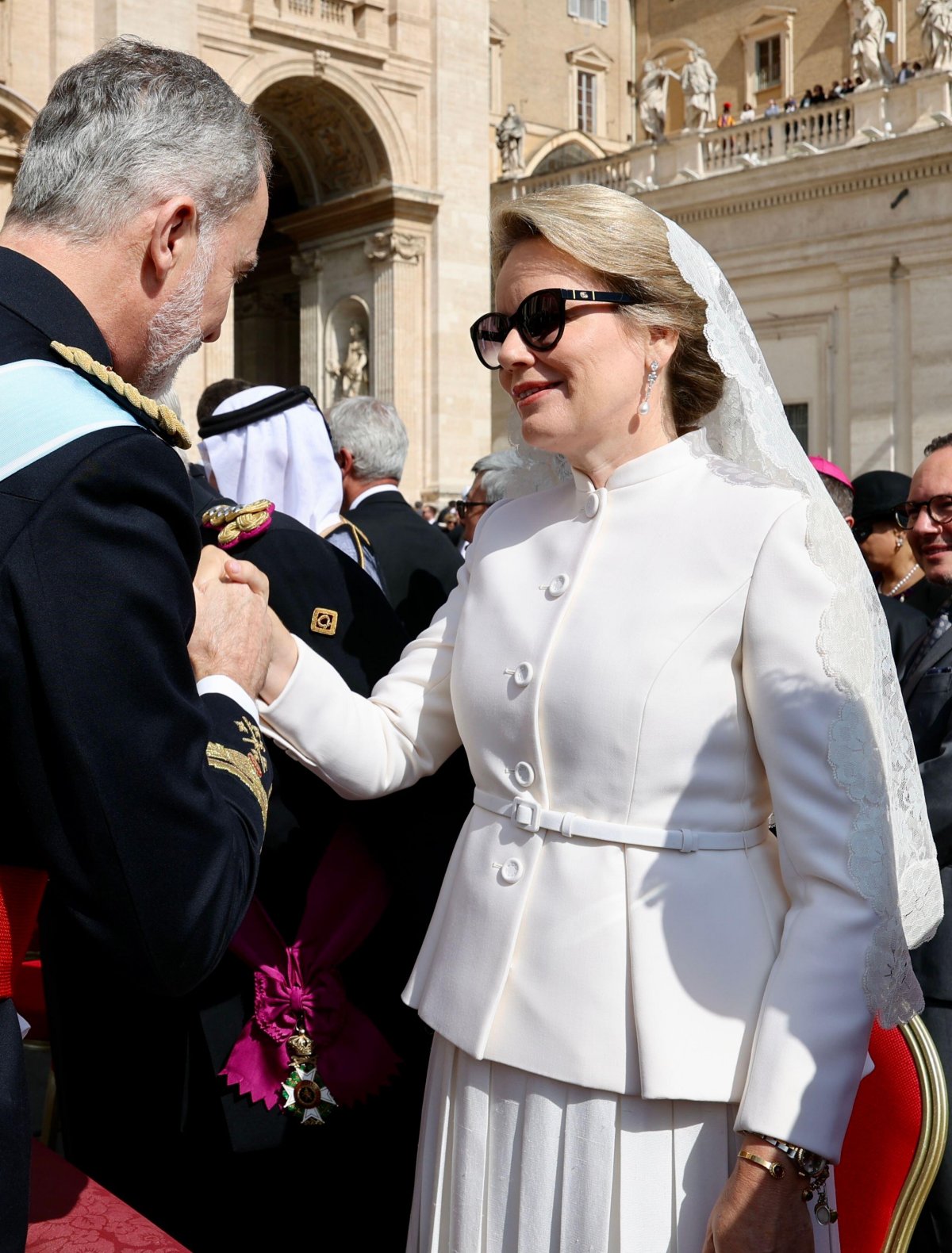 King Philippe and Queen Mathilde of the Belgians wore similar attire for the mass: military uniform and decorations for Philippe and a white Christian Dior ensemble with a veil for Mathilde.