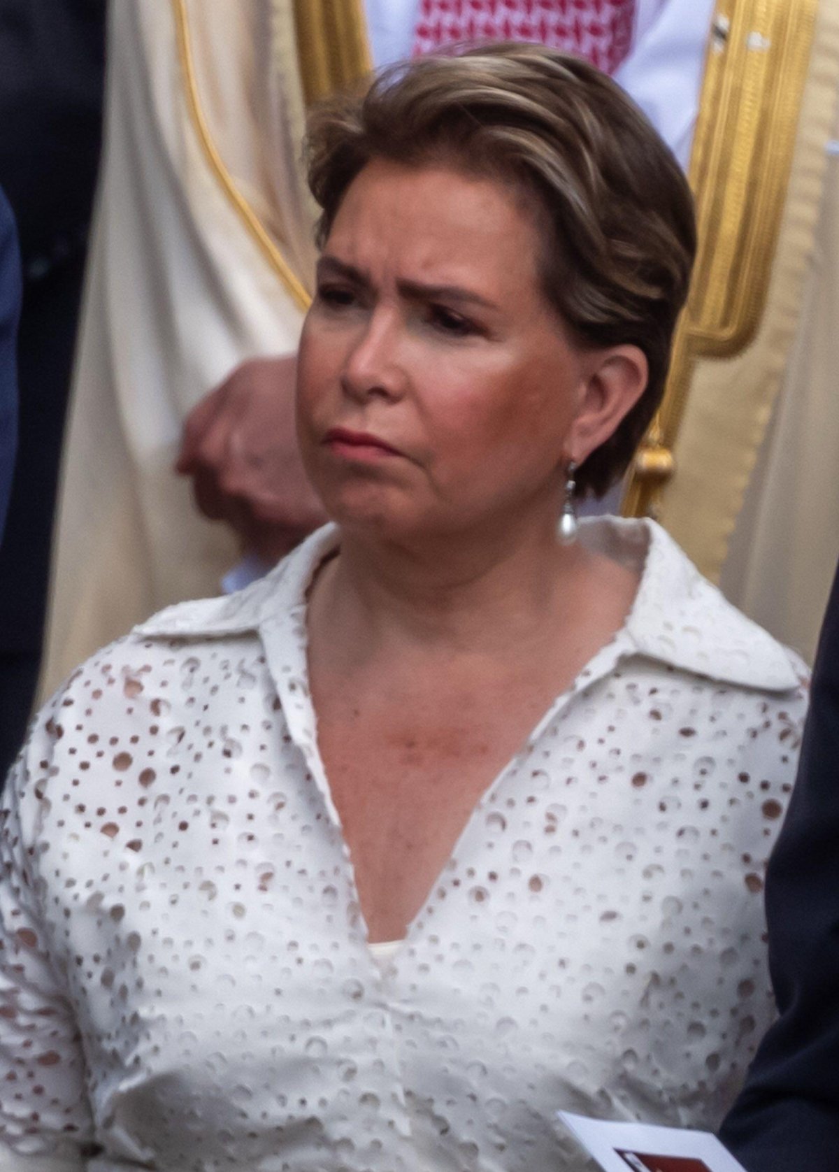 Grand Duchess Maria Teresa accessorized with a gorgeous pair of antique diamond and pearl drop earrings from the Luxembourgish vaults for the mass.