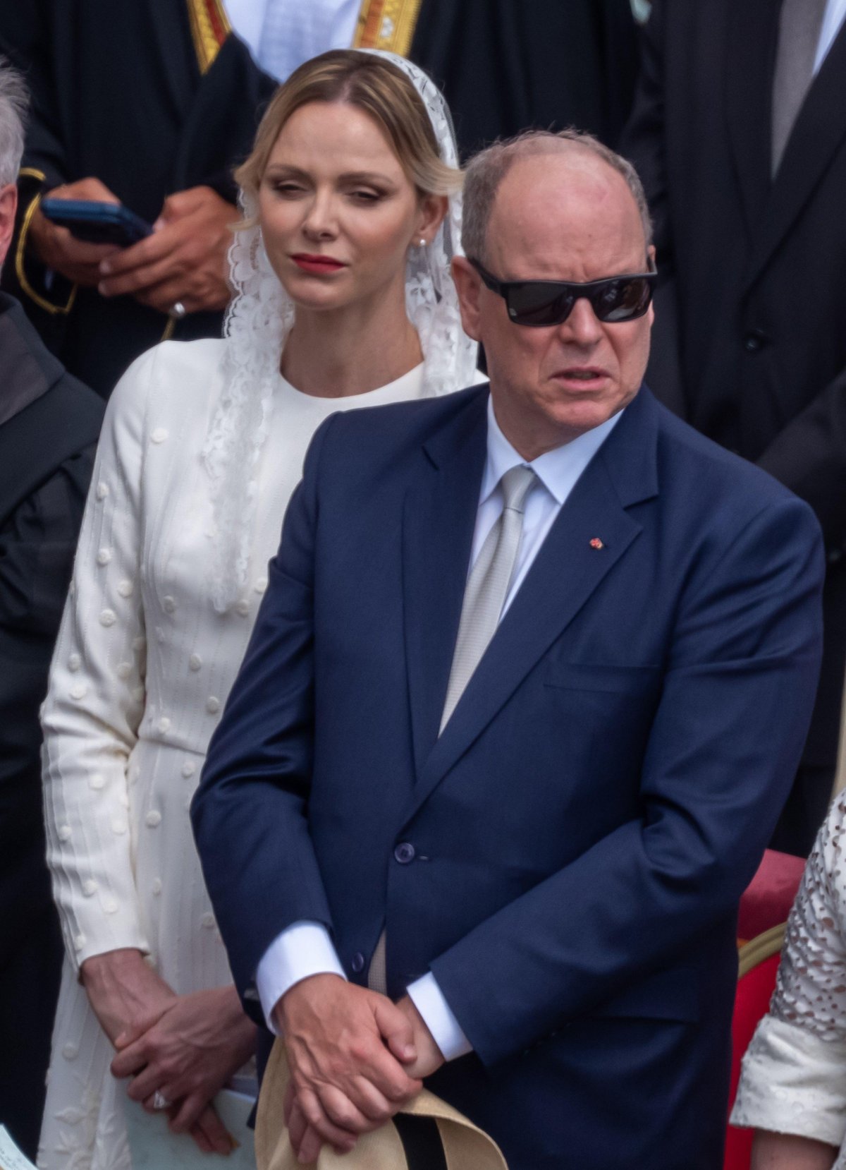 Prince Albert II of Monaco wore a business suit for the inauguration ceremony, while Princess Charlene wore a textured white dress with a white lace veil for the occasion.