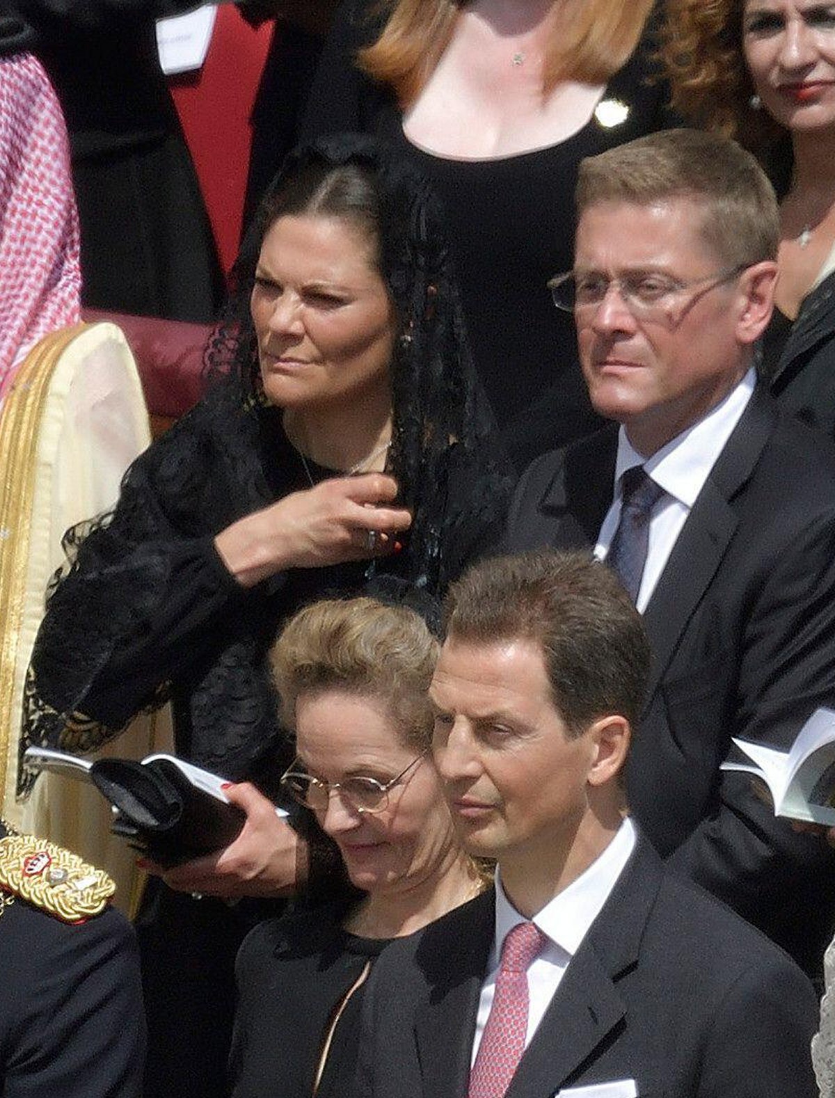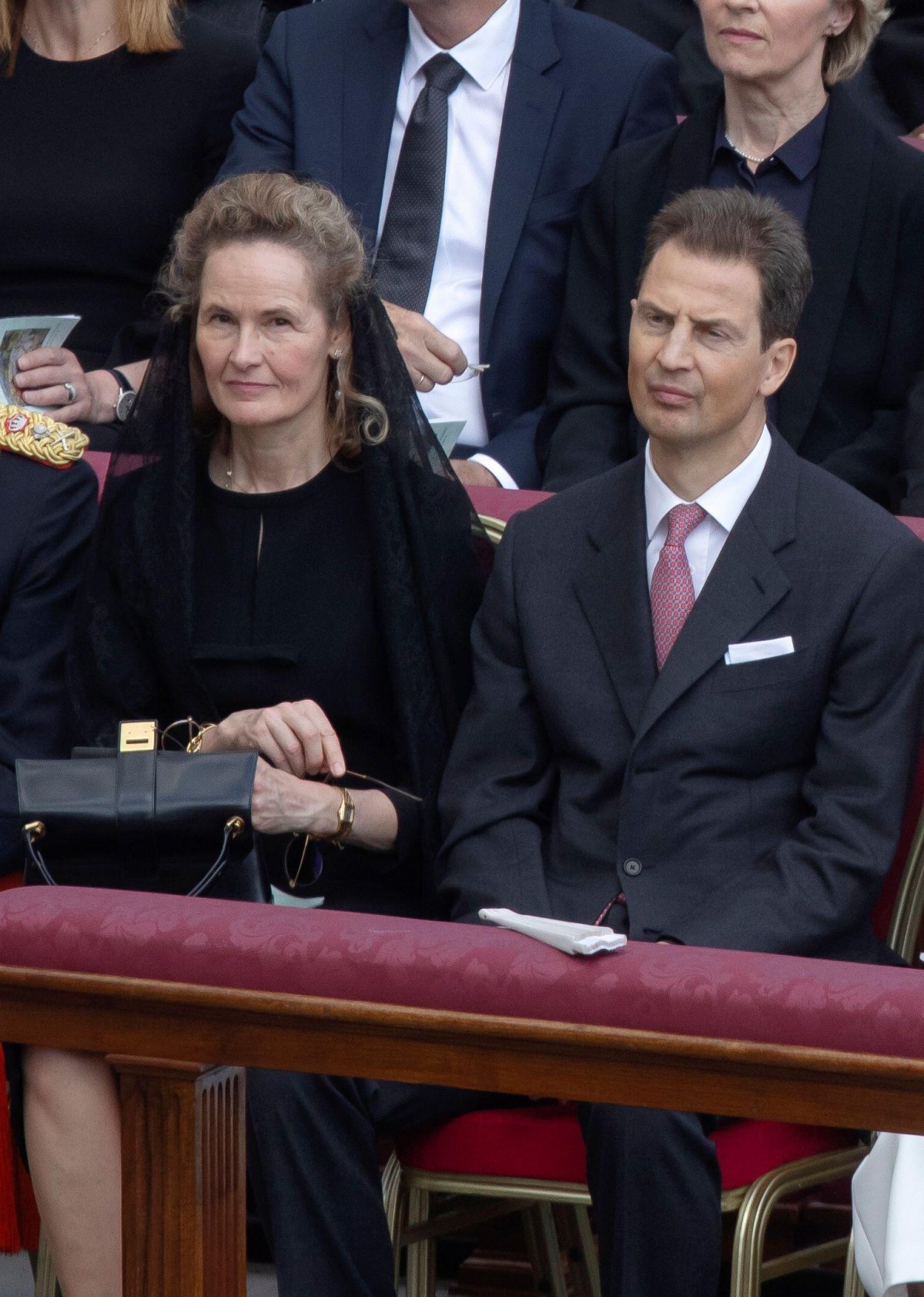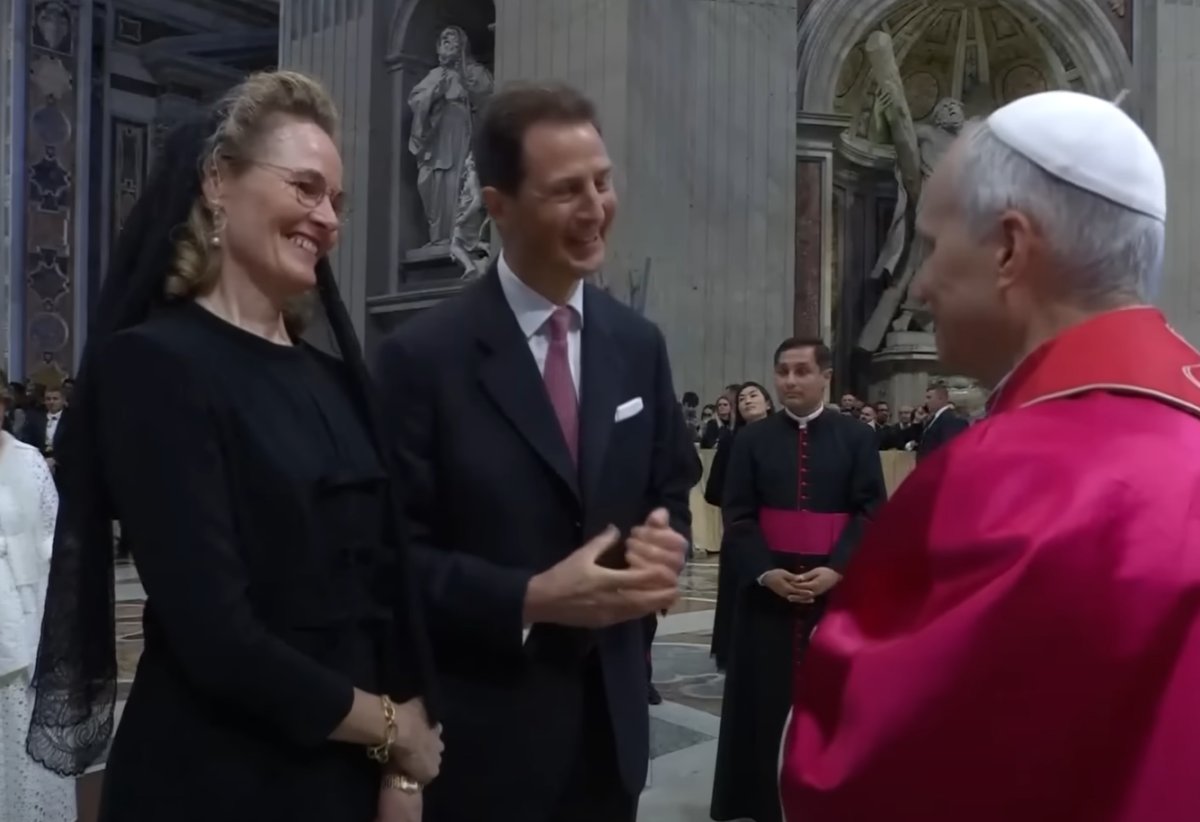 Hereditary Prince Alois of Liechtenstein, wearing a business suit, attended the mass with his wife, Hereditary Princess Sophie, who wore a black dress and veil. Although both Alois and Sophie come from Roman Catholic royal families—Sophie is a member of the Bavarian royal family and, notably, is currently second in line for the Jacobite succession (!)—the ladies of the Liechtenstein princely family have not traditionally been afforded the privilege du blanc. Sophie’s husband is also not the reigning prince. Though Alois has been the regent for many years, his father, Hans-Adam II, remains the Prince of Liechtenstein.