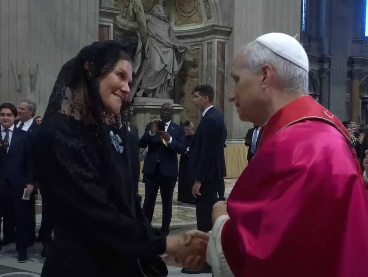 And the King of Sweden sent his eldest daughter and heir, Crown Princess Victoria, as his representative at the inauguration mass. She’s pictured here, wearing a black dress and veil, as she congratulates Pope Leo inside the basilica afterward.