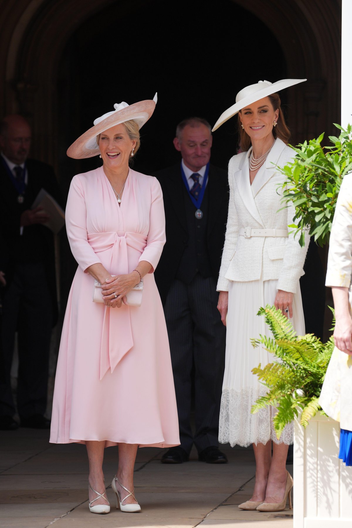 Members of the royal family who have not received the Order of the Garter waited for their spouses on the Galilee Porch ahead of the service. The Princess of Wales was elegant in a white ensemble from Self Portrait and a coordinating Sean Barrett hat for the service, while the Duchess of Edinburgh wore a favorite ’40s-inspired pink dress from Suzannah with a Jane Taylor hat.