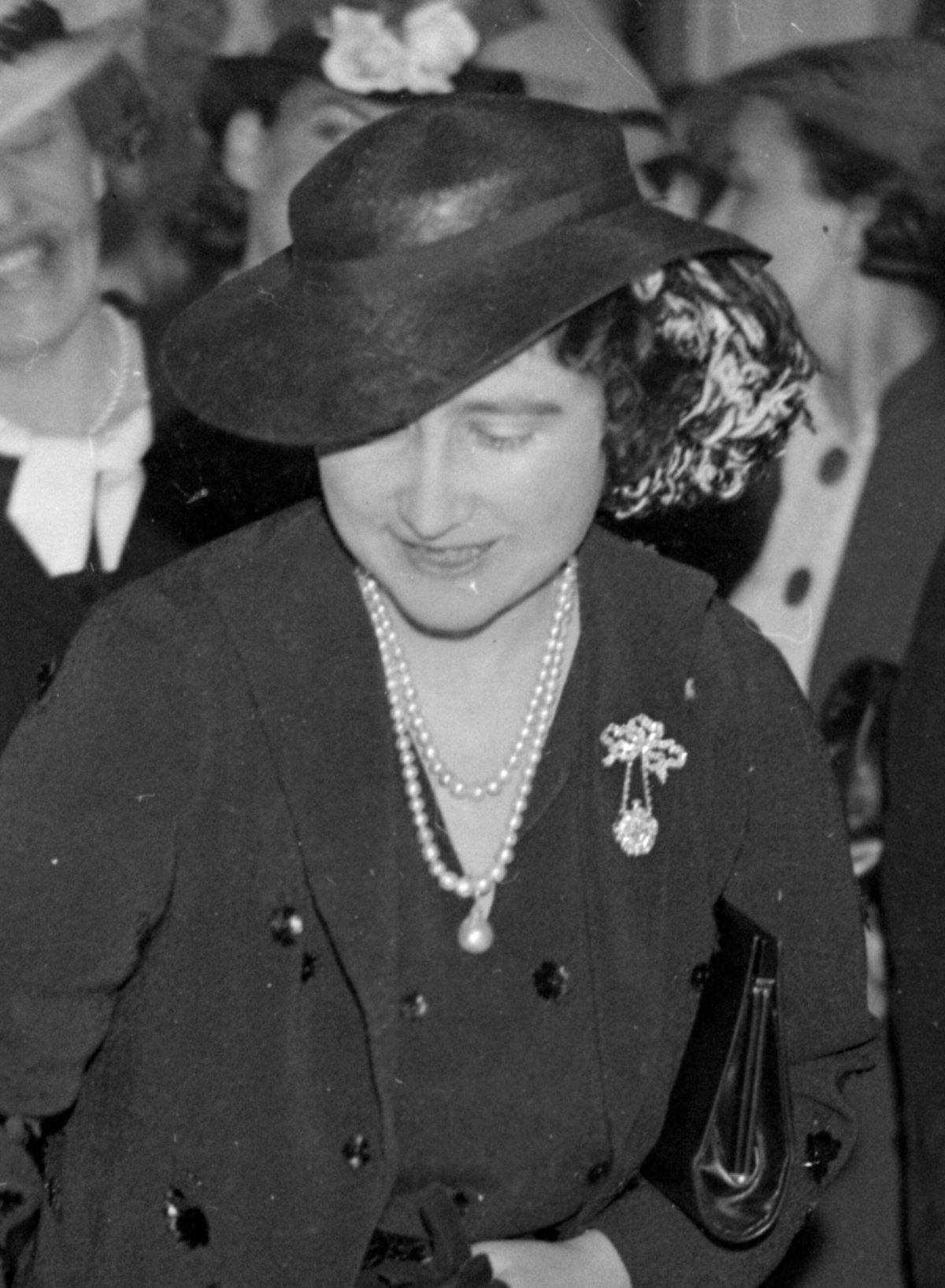 Here’s a close-up of Elizabeth wearing the diamond watch brooch, with the details of the piece clearly visible against her black jacket. (The royal family was in mourning for King George V at this point in time.)