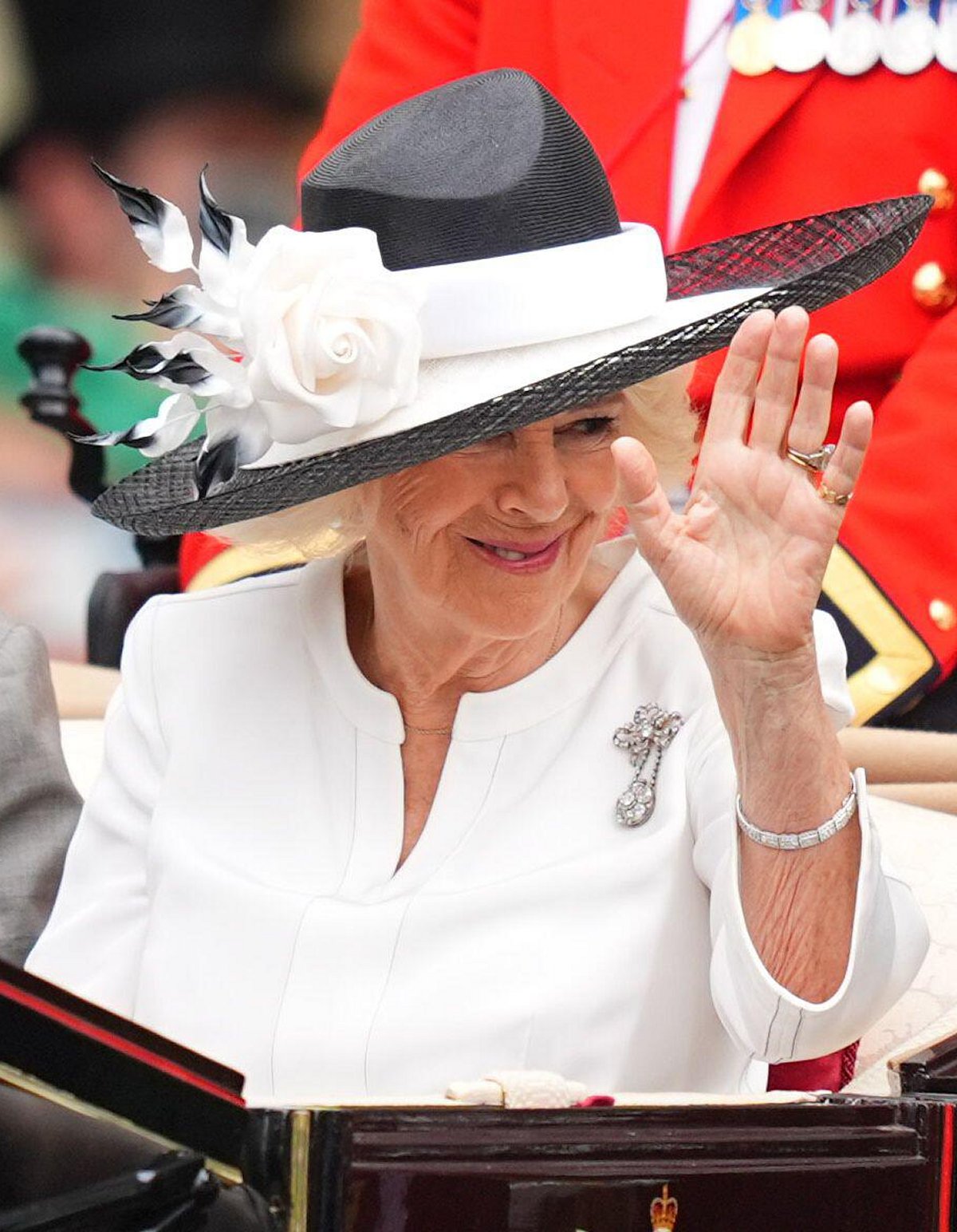 Queen Camilla, though, pulled off the biggest jewelry surprise of the race meeting by wearing an elaborate diamond jewel, the Rothschild Diamond Watch Brooch, that was given to the future Queen Mary as a wedding present in the summer of 1893.