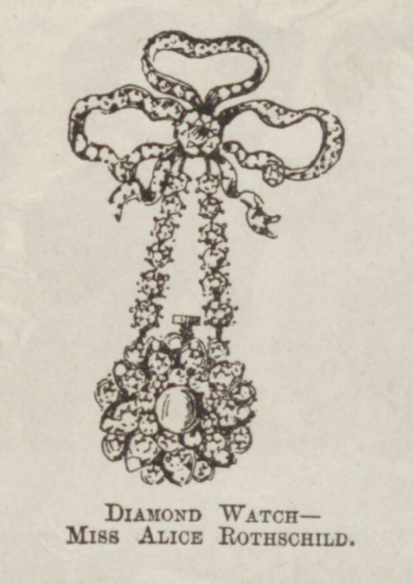 The brooch is comprised of two sections: a diamond bow and a round diamond floral pendant, suspended from a diamond chain. The pendant conceals a watch. It was a wedding present to Mary of Teck in July 1893 from Alice de Rothschild. Known as “Miss Alice,” she was a member of the famed Rothschild banking family. She inherited a lavish British country house, Waddesdon Manor, from her brother and filled it with carefully curated collections—something that she and Queen Mary had in common.