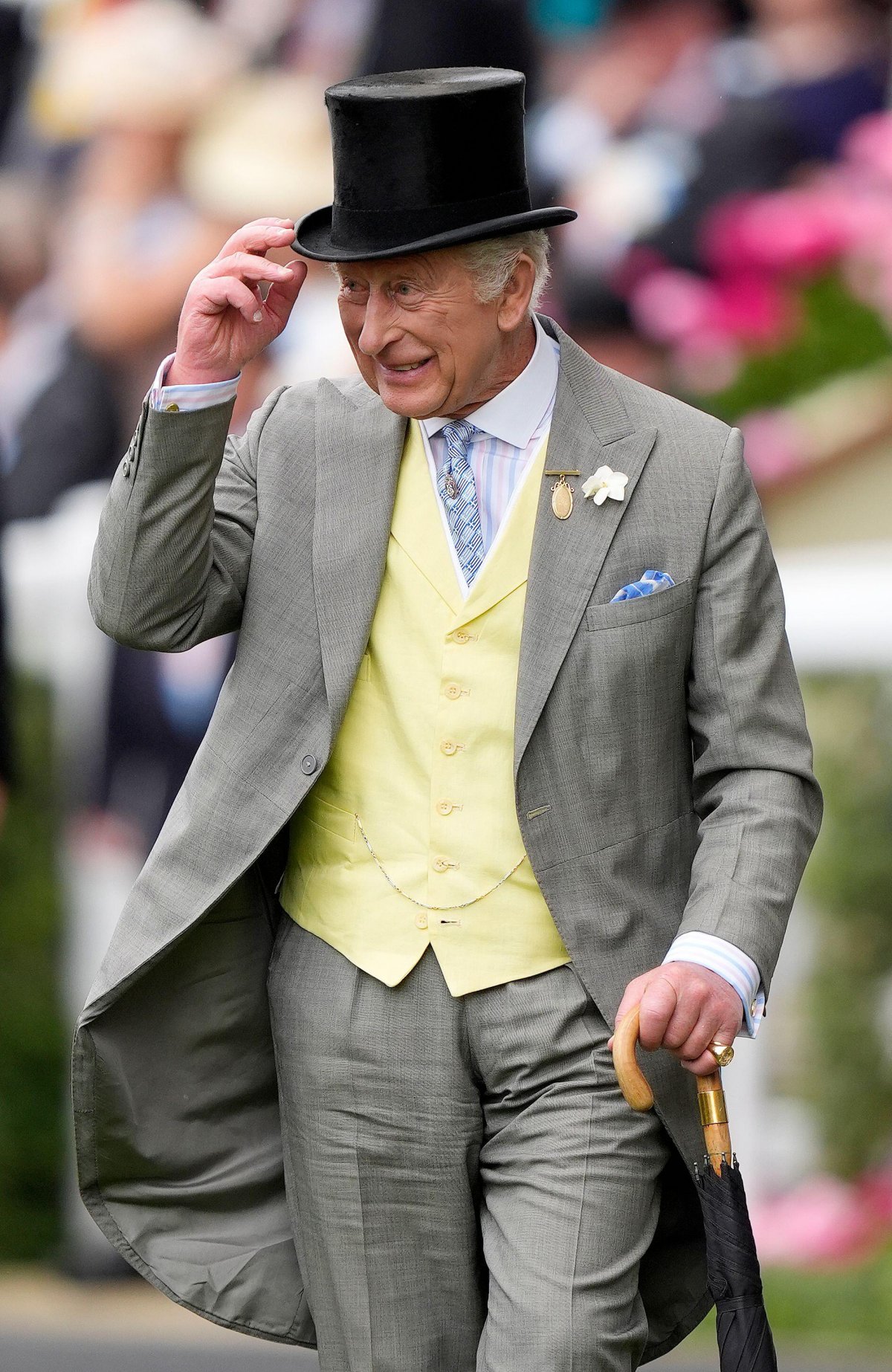 King Charles III was once again dapper in a gray morning suit, worn on Saturday with a yellow waistcoat and a blue and pink patterned shirt. He secured his blue patterned tie with a favorite tie pin featuring the royal cypher of Tsar Boris III of Bulgaria.