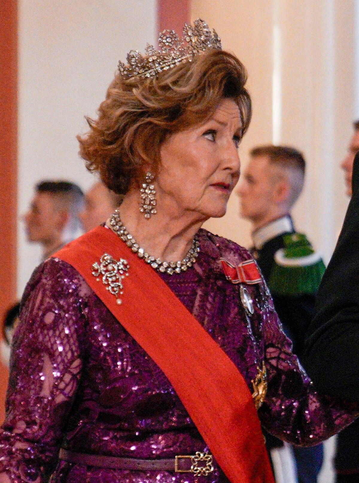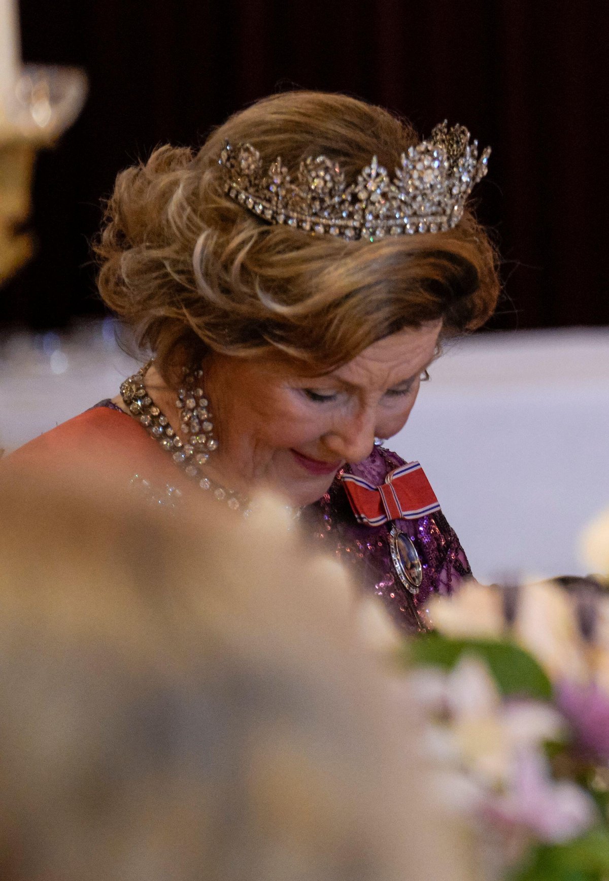 With her gala gown, Queen Sonja wore a tiara that has become a relatively rare sighting in recent years: the diamond tiara that belonged to Queen Josefina of Sweden and Norway. It was a legacy from Josefina’s grandmother and namesake, Empress Joséphine of France—making it a perfect tiara to wear to welcome a French president to Norway. The tiara has hopped around royal jewelry boxes in Scandinavia, spending time with Queen Lovisa of Denmark and her son, Prince Gustav, before ending up in Norway with Crown Princess Märtha and Queen Sonja.