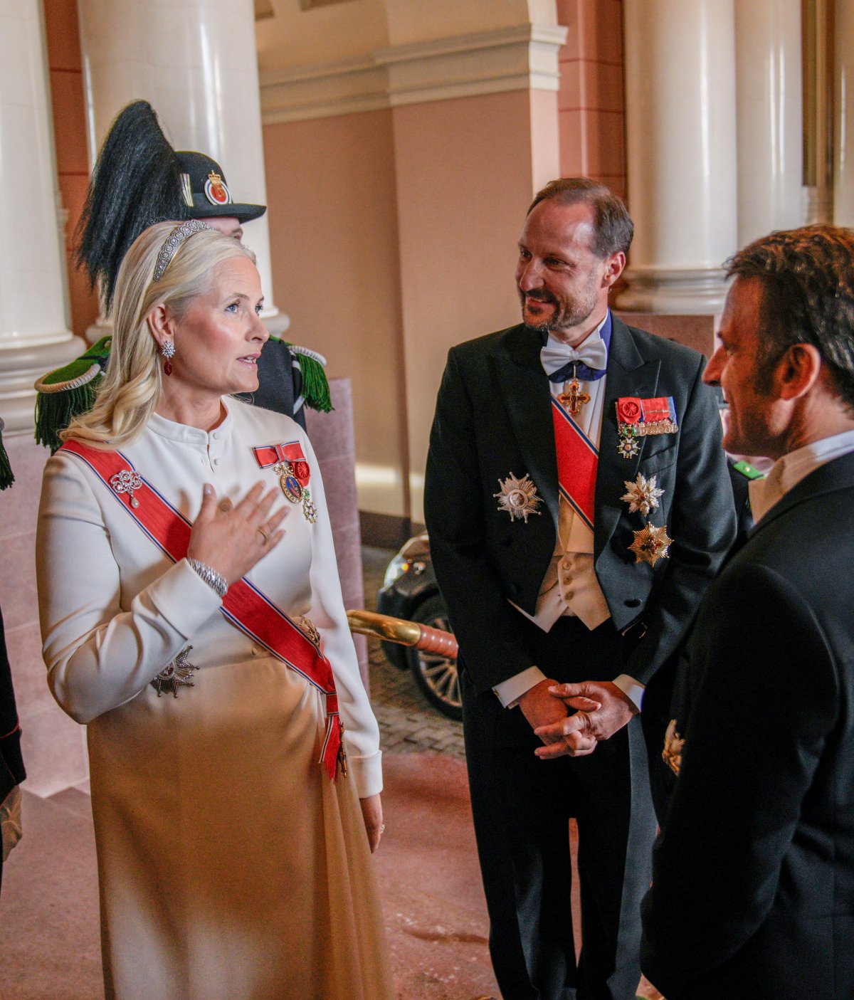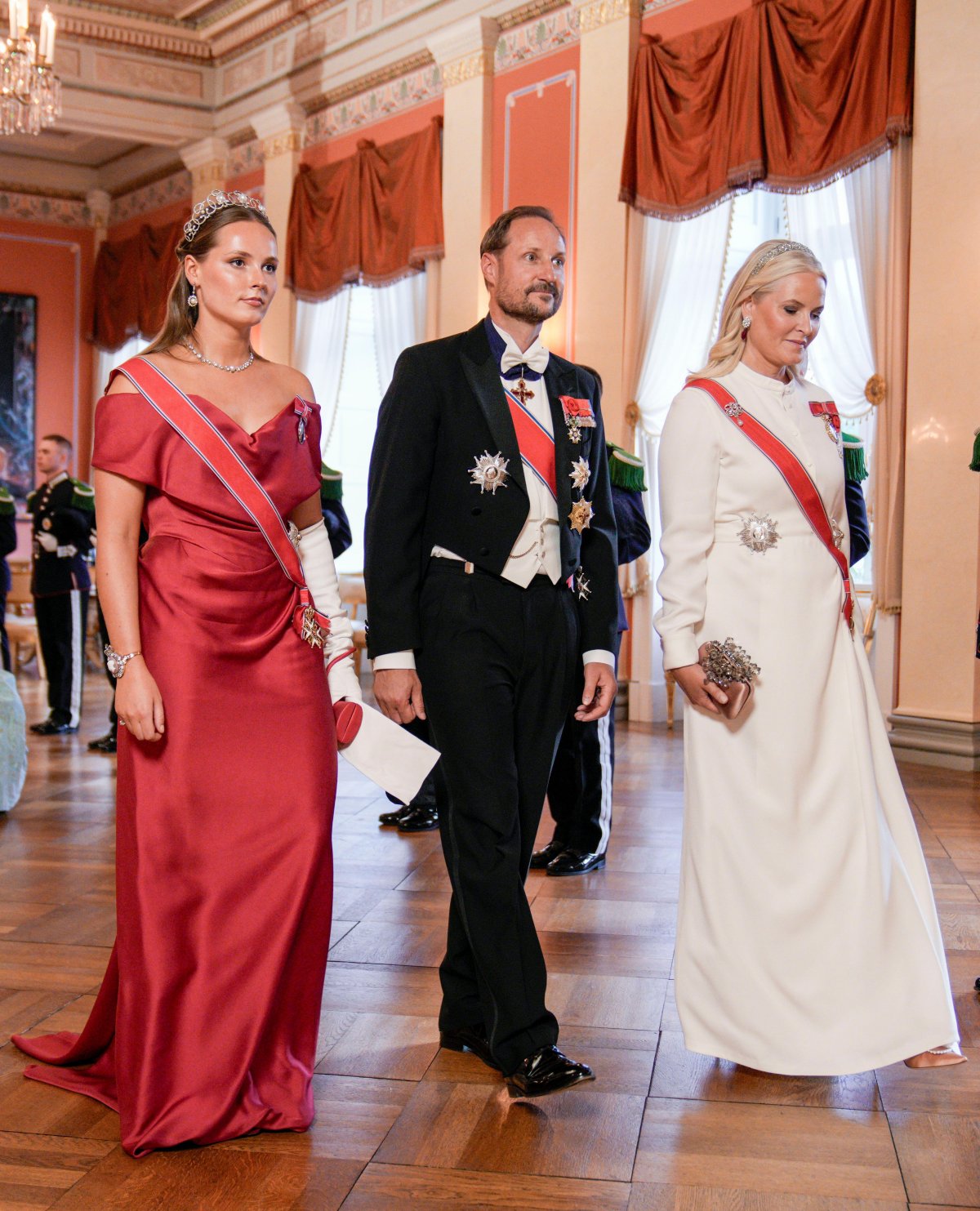 Crown Prince Haakon, wearing the red sash of the Order of St. Olav and the badge of the Legion of Honor, arrived at the gala dinner with his wife, Crown Princess Mette-Marit, and their daughter, Princess Ingrid Alexandra.