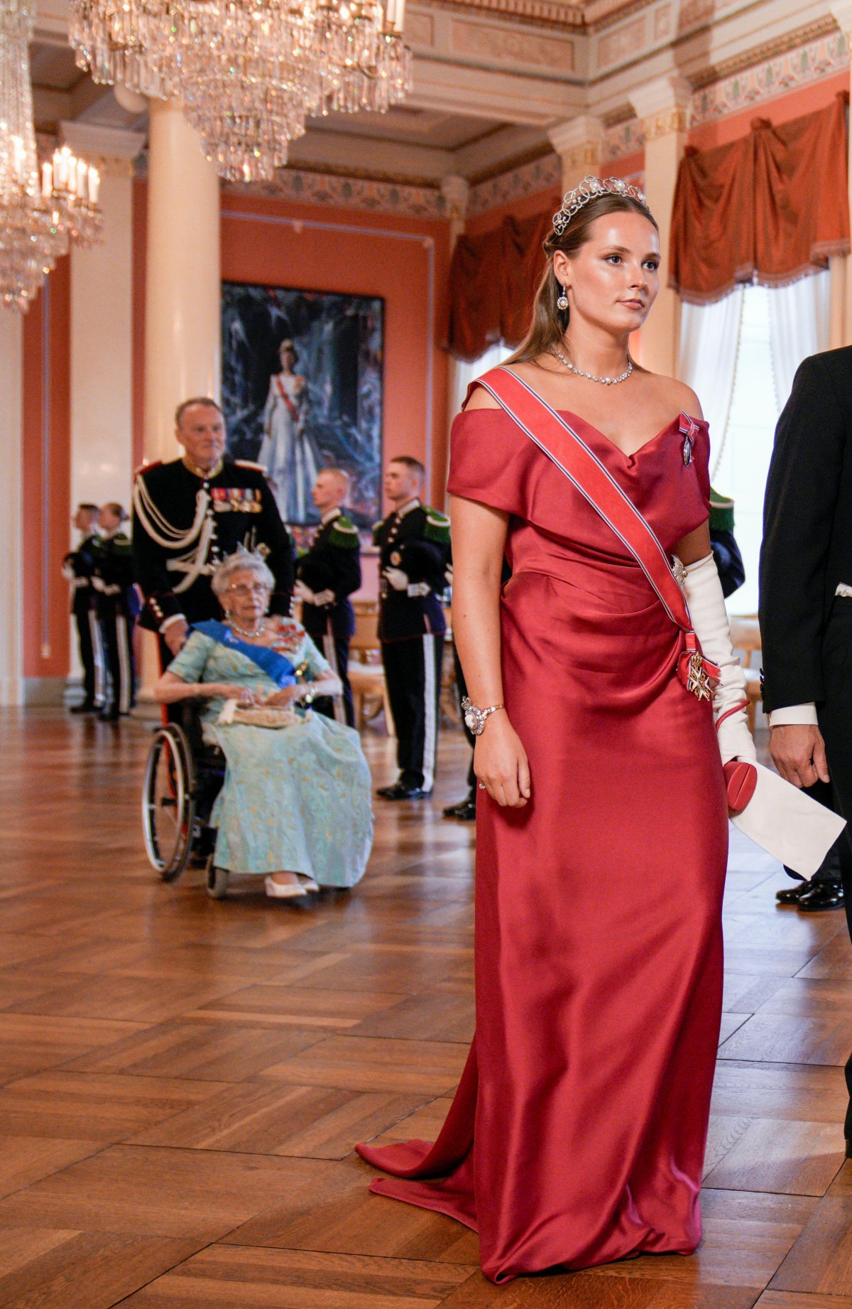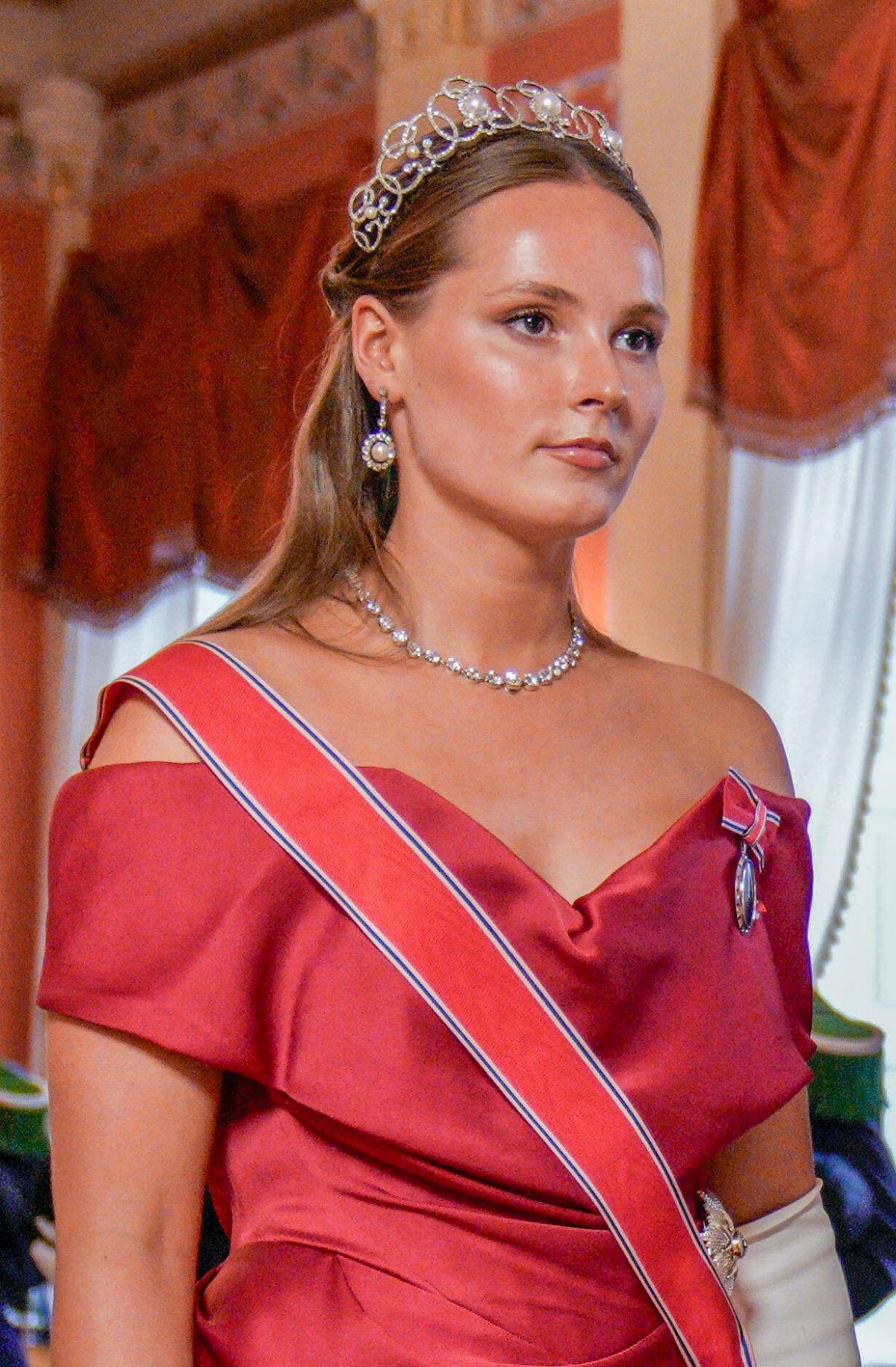 Princess Ingrid Alexandra wore a scarlet red evening gown with the Order of St. Olav and her grandfather’s Royal Family Order for the banquet, paired with a tiara that now belongs to her: the diamond and pearl circle tiara from the collection of the King’s grandmother, Princess Ingeborg. The tiara later belonged to the King’s sister, Princess Ragnhild, who passed away in 2012. Her children decided to give the tiara to Princess Ingrid Alexandra, who has been wearing it regularly since she turned 18 in 2022.