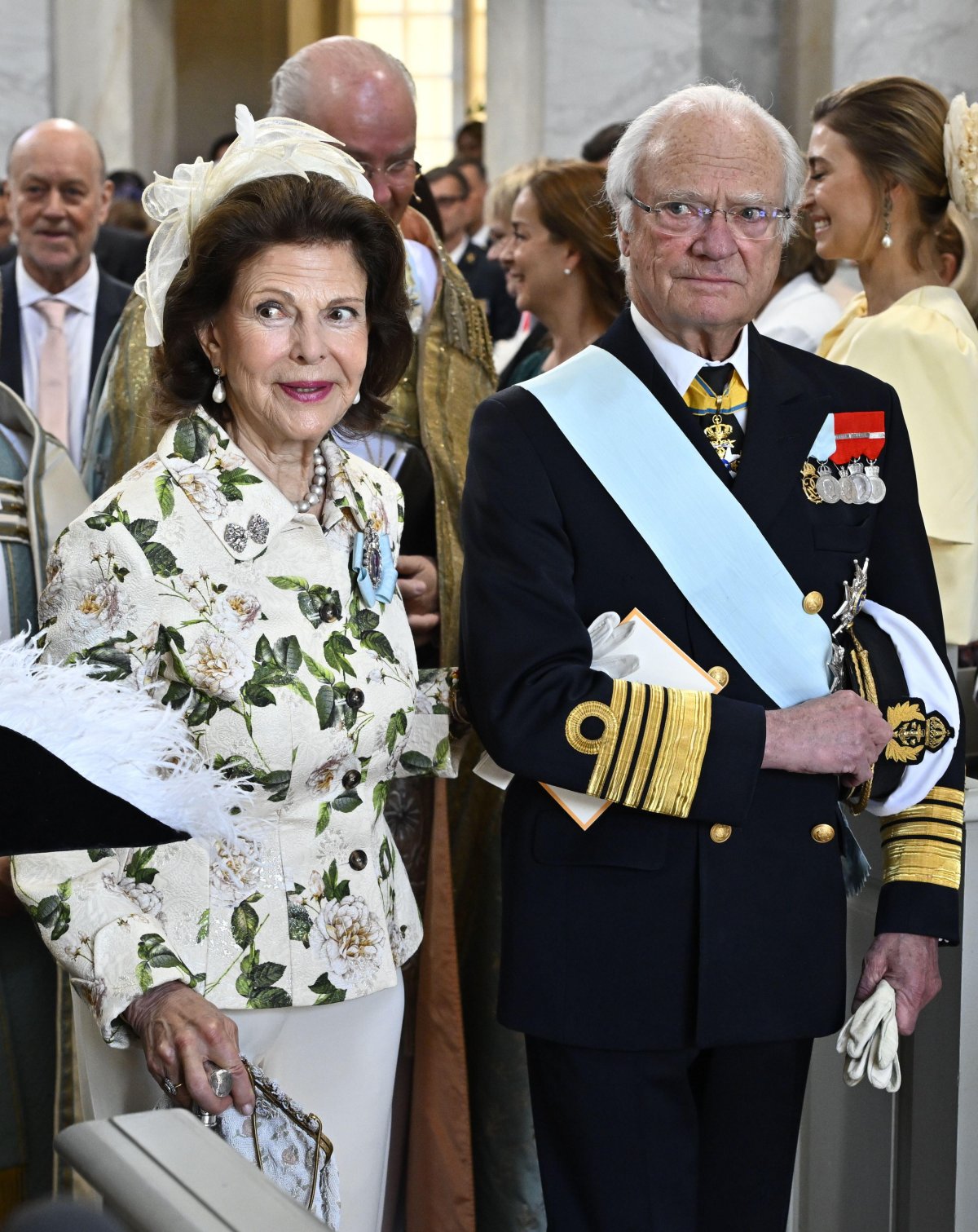 For the event, Queen Silvia wore a jacket with a lovely floral pattern in shades of cream and green, paired with cream-colored trousers and a coordinating headpiece. The King’s Royal Family Order was also pinned to the jacket.